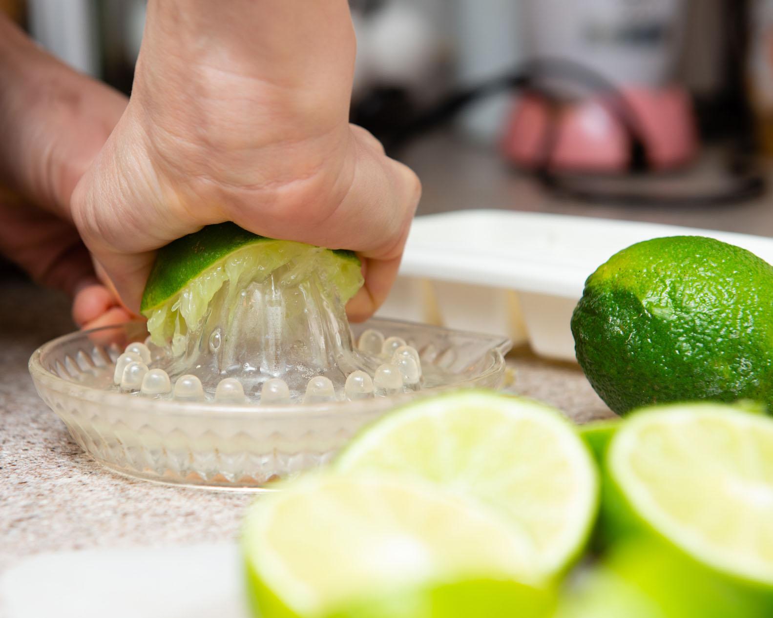 Para fazer esta receita de caipirinha cremosa comece por extrair o suco dos limões. Coloque esse suco no copo do liquidificador ou no copo de mixer manual para preparar este drink de liquidificador.