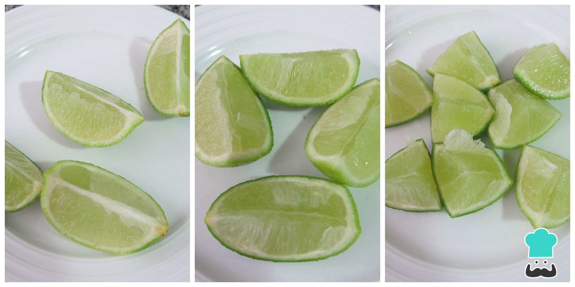 Para preparar esta caipirinha exótica comece por cortar o limão em gomos, retirar o filamento branco e cortar em metades.