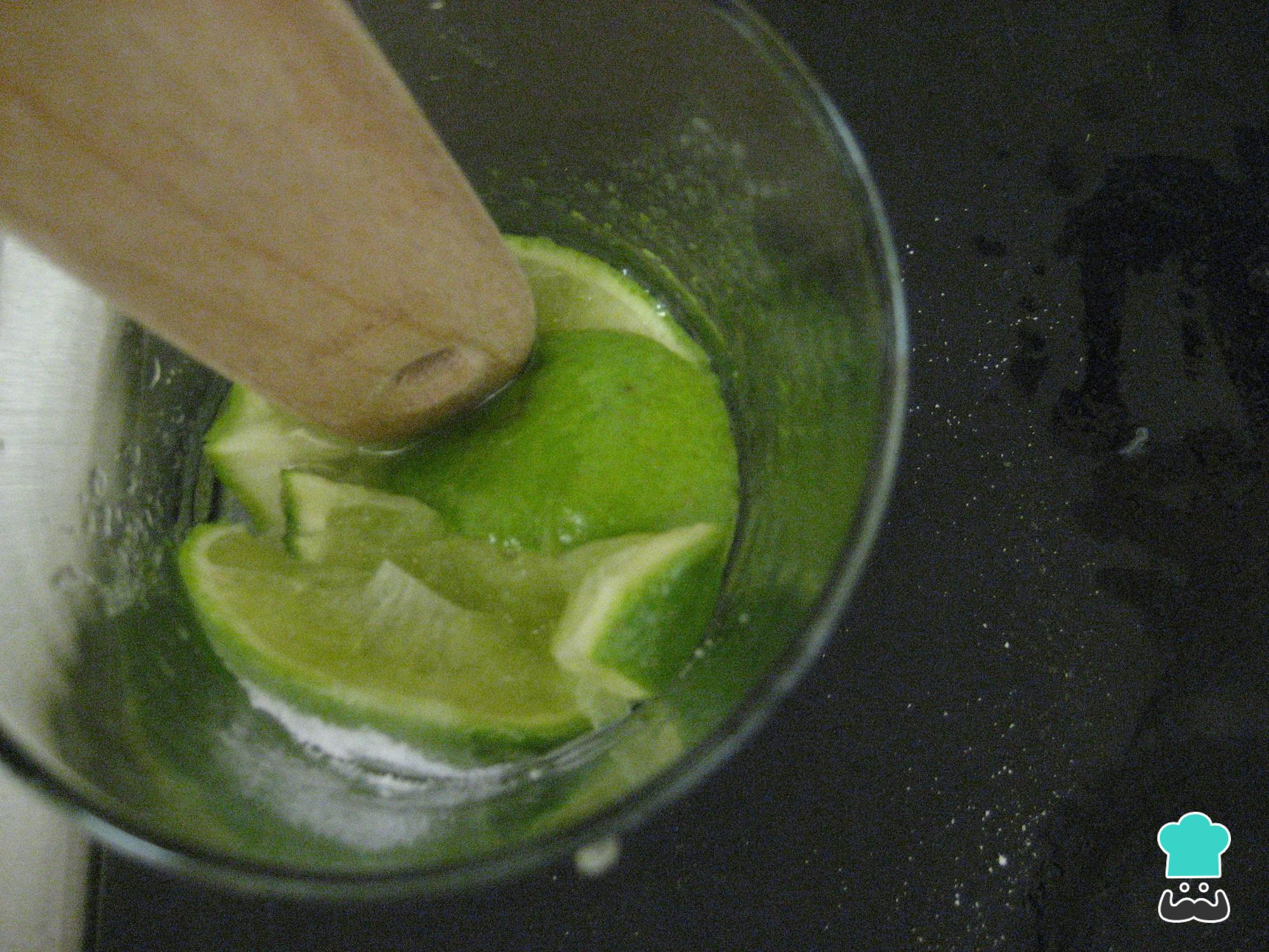 Distribua o limão pelos copos de caipirinha, adicione o açúcar e amasse com o socador. Acrescente os restantes ingredientes e misture tudo.