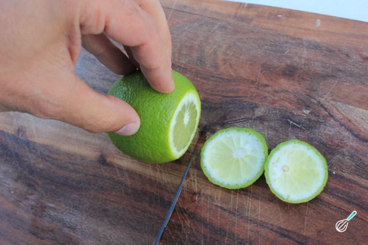Para preparar esta receita de caipirinha comece por lavar o limão, cortar as extremidades e cortar em 4. Retire o filamento branco do limão, para não azedar a bebida, e corte cada parte em metade.