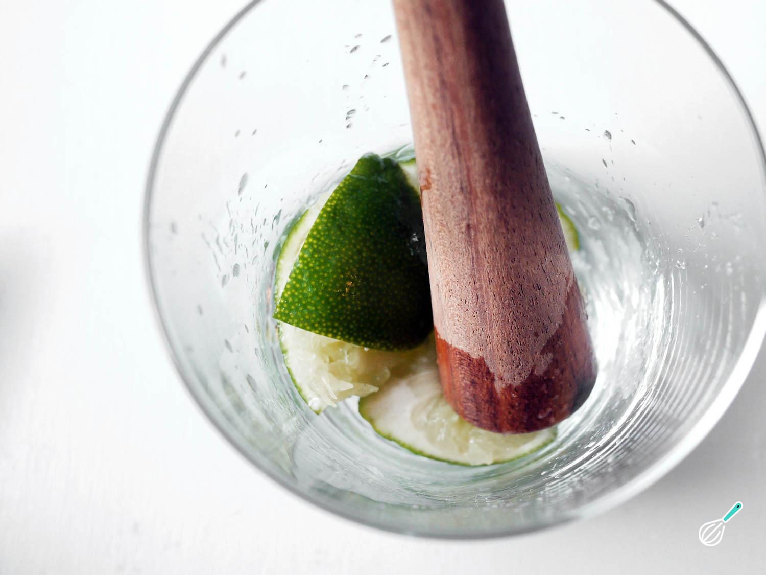 Prepare a caipirinha do jeito tradicional: distribua o limão e o açúcar pelos copos e esmague com um socador.