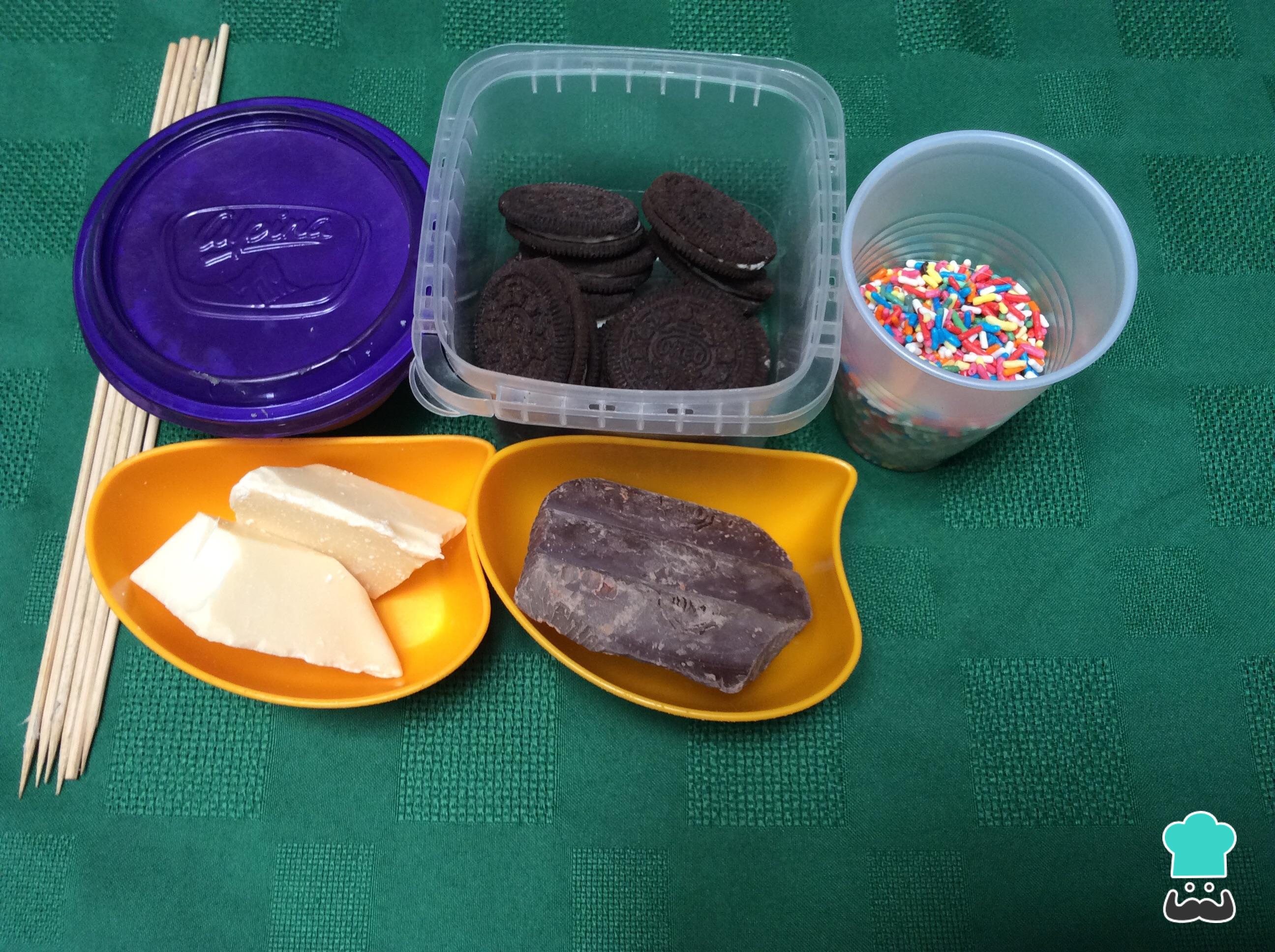 Para preparar estes irresistíveis cake pops de Oreo, comece por reunir os ingredientes. As quantidades indicadas servem cerca de 6 cake pops.