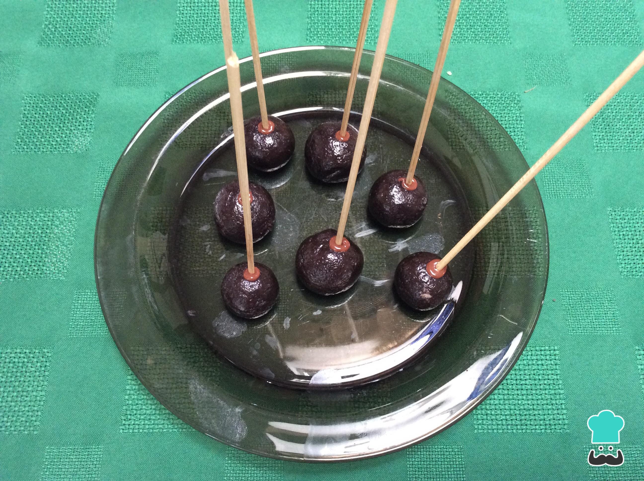 Derreta um pouco do chocolate de leite em banho-maria ou no microondas, e mergulhe nele as pontas dos palitos de espeto. Espete essa ponta dos palitos nos cake pops de Oreo e reserve na geladeira por 1 hora.