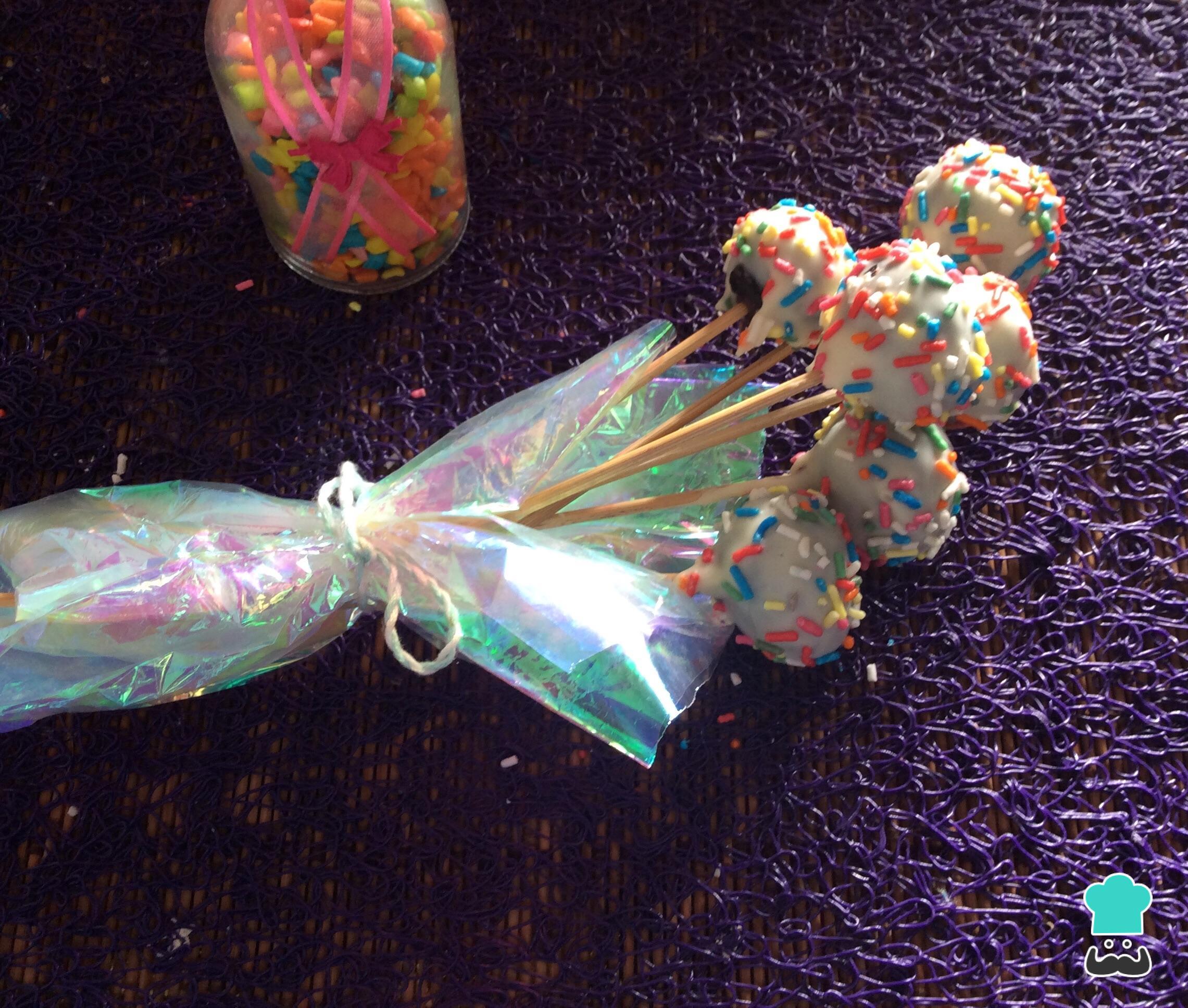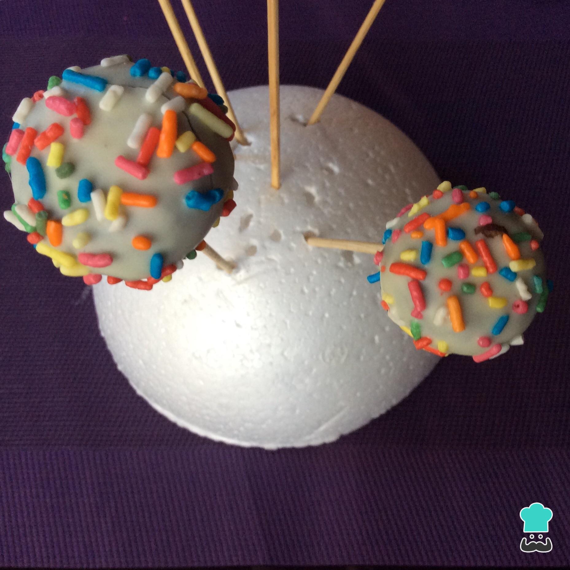 Após o tempo indicado, derreta o chocolate branco em banho-maria ou no microondas, mergulhe nele os cake pops geladinhos e polvilhe os confeitos coloridos. Deixe os cake pops secar em pé, colocados num fracos ou presos numa bola de isopor.