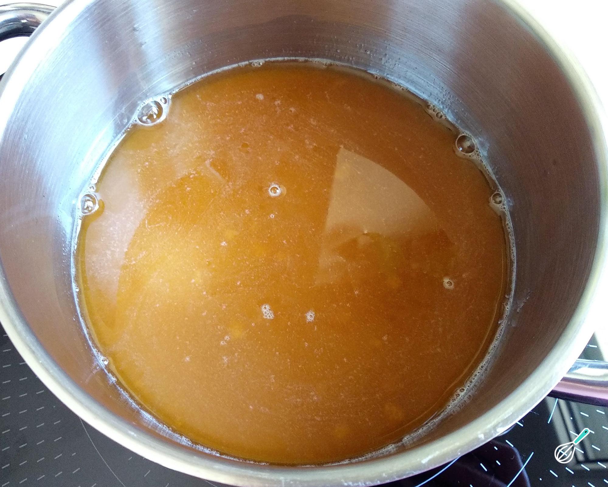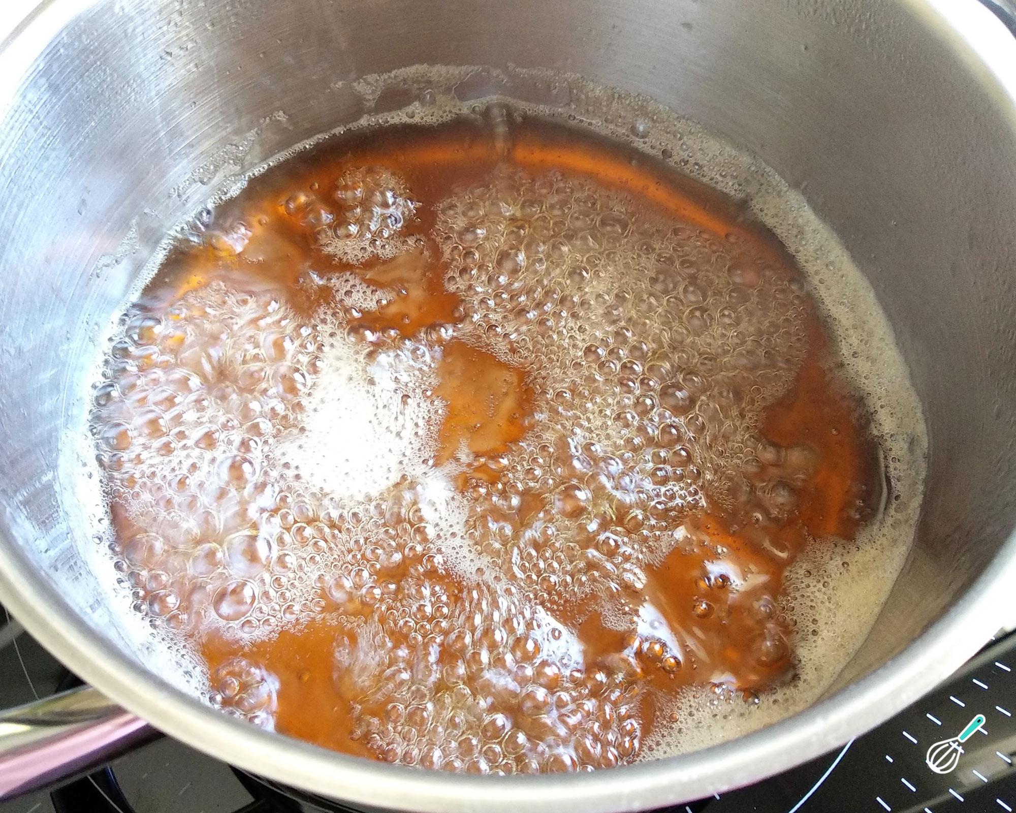 Deixe essa calda de açúcar ferver no fogo médio até escurecer e ficar mais consistente. Para evitar queimar, simplesmente agite a panela de vez em quando.