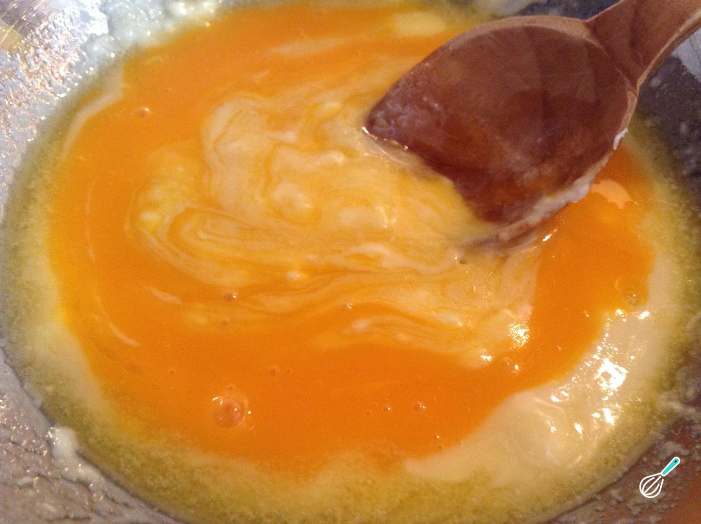 Em seguida adicione a polpa do maracujá e mexa, para misturar com o caramelo.