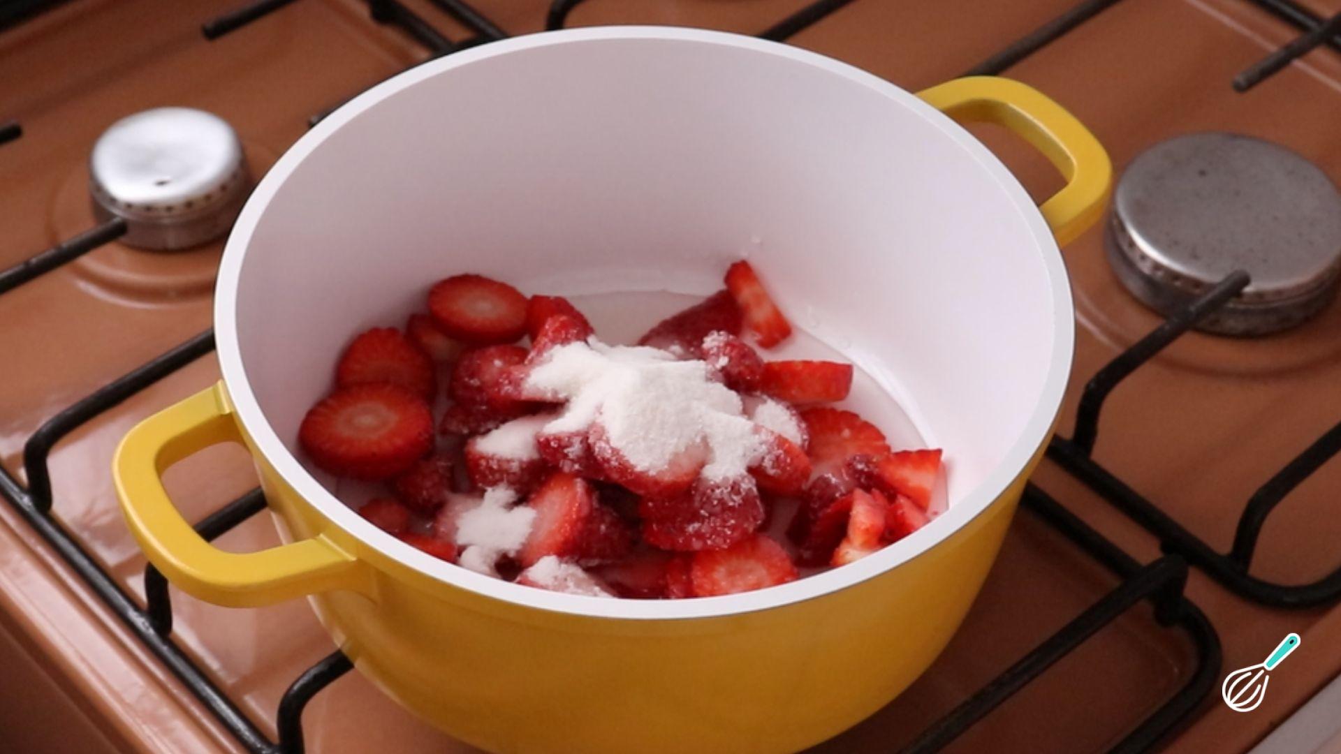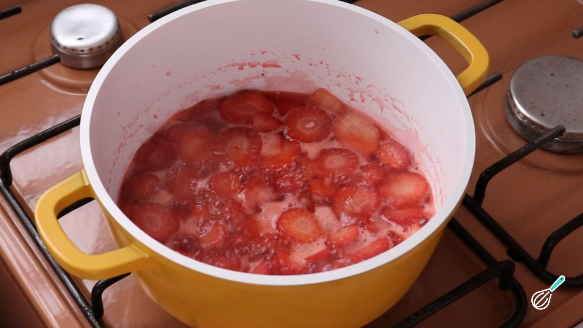 Leve uma panela ao fogo médio e adicione todos os ingredientes: os morangos picados, o açúcar e a água.