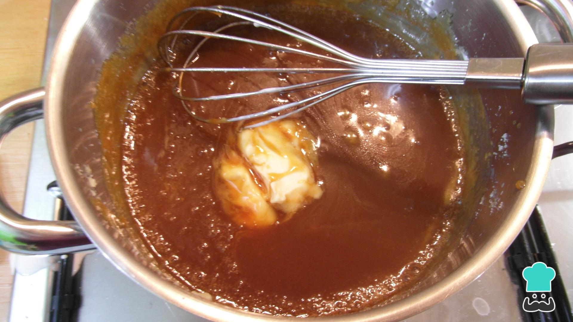 Quando o açúcar virar uma calda espessa, baixe o fogo e adicione o creme de leite aos poucos, enquanto mexe. Adicione a manteiga quando a mistura estiver homogênea.