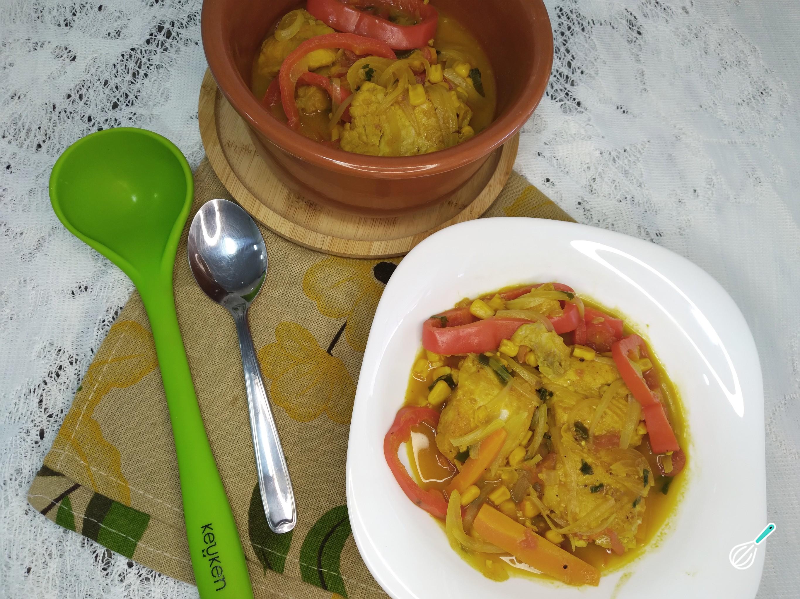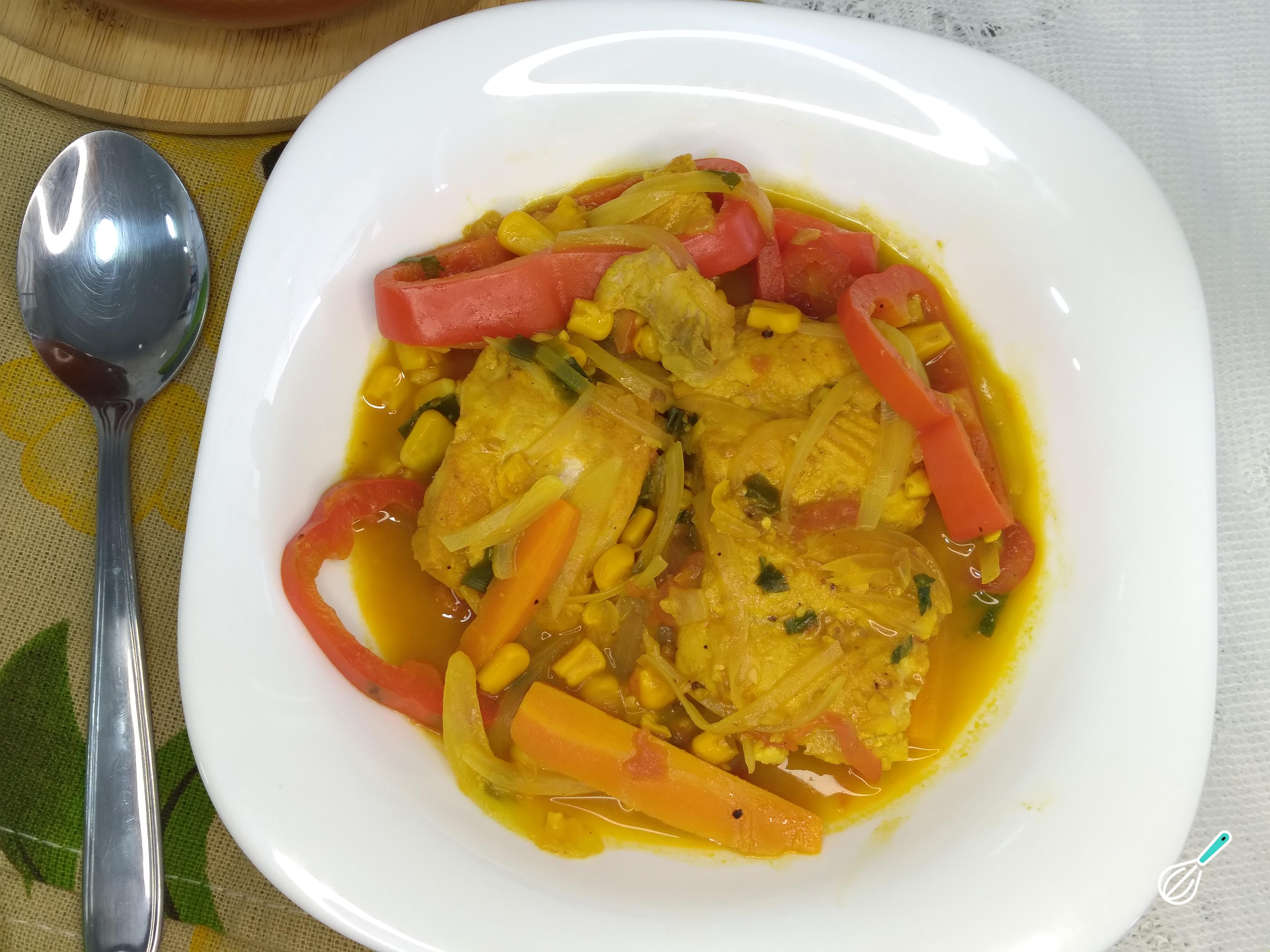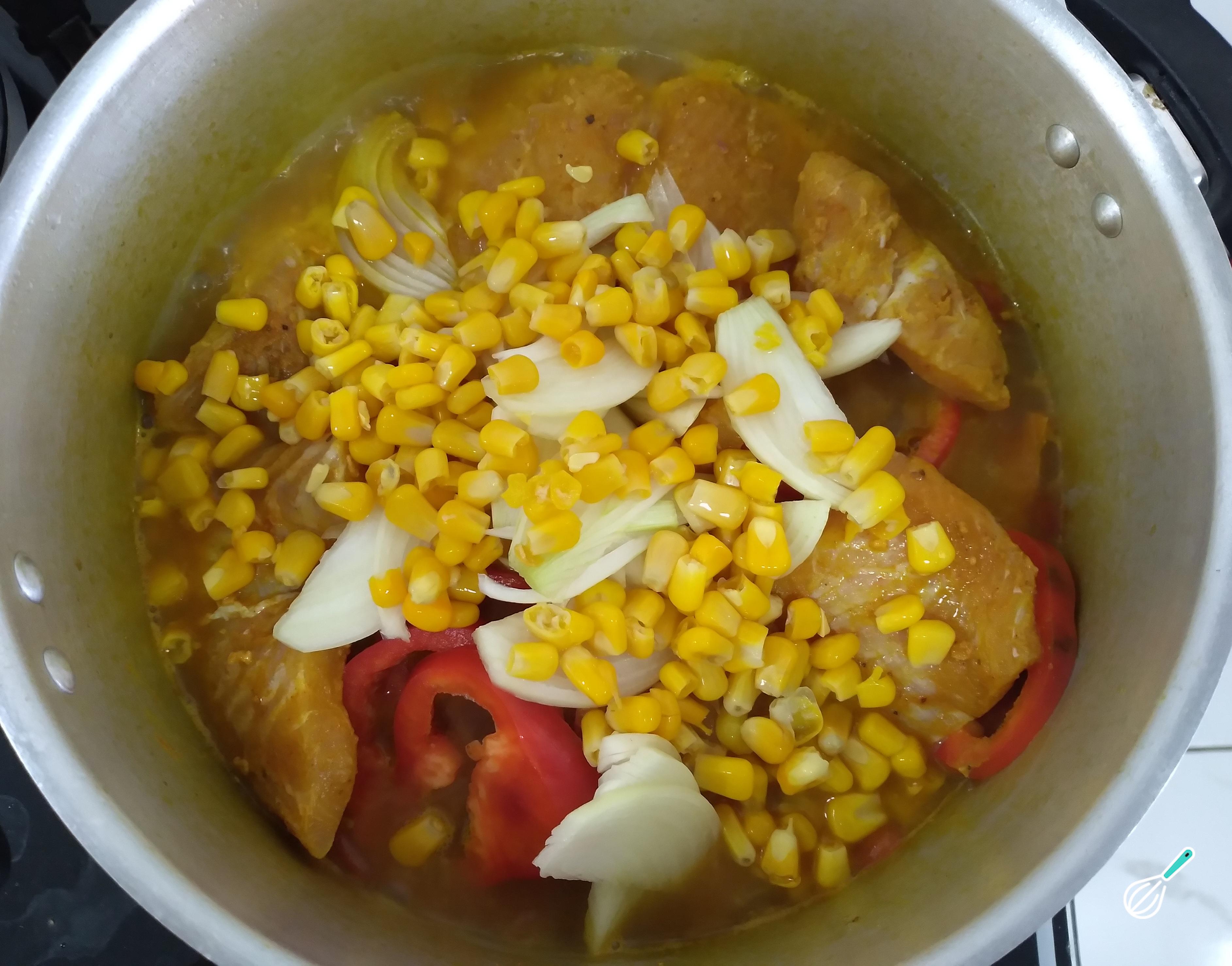 Depois que o caldo estiver engrossando, acrescente o peixe, o milho, o pimentão e a cebola picada em meia lua. Tampe a panela e deixe que cozinhem mais um pouco. Experimente para acertar o sal. Por último acrescente a cebolinha verde e a salsinha. Deixe agregar os sabores. Mexa com delicadeza para não quebrar o peixe. Desligue quando o caldo estiver quase secando. É importante deixar um caldo na caldeirada. Não deixe que seque muito.