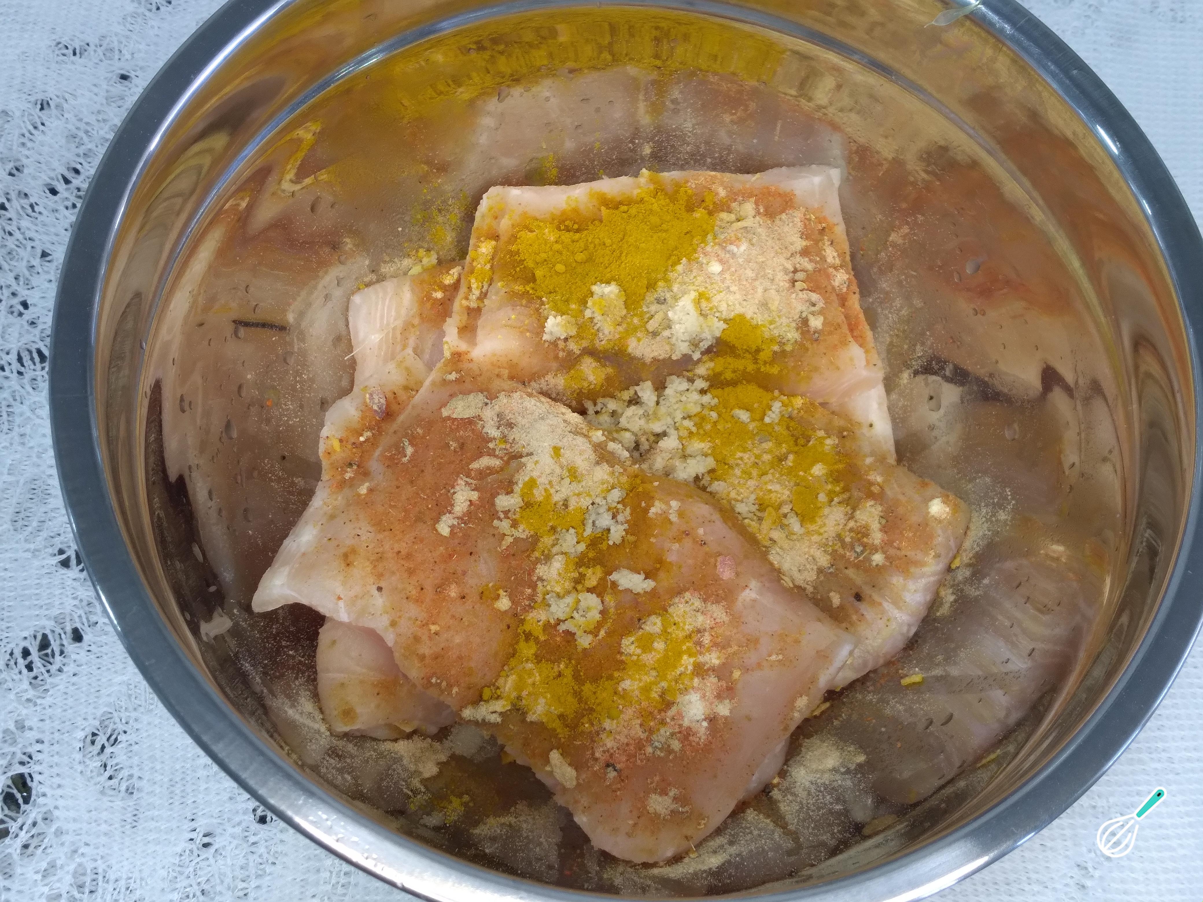 Feito isso, em um bowl, coloque o peixe, tempere com limão, sal e metade dos temperos. Reserve a outra metade para o caldo. Misture muito bem o tempero ao peixe, assim absorverá os sabores. Feito isso, reserve o peixe.