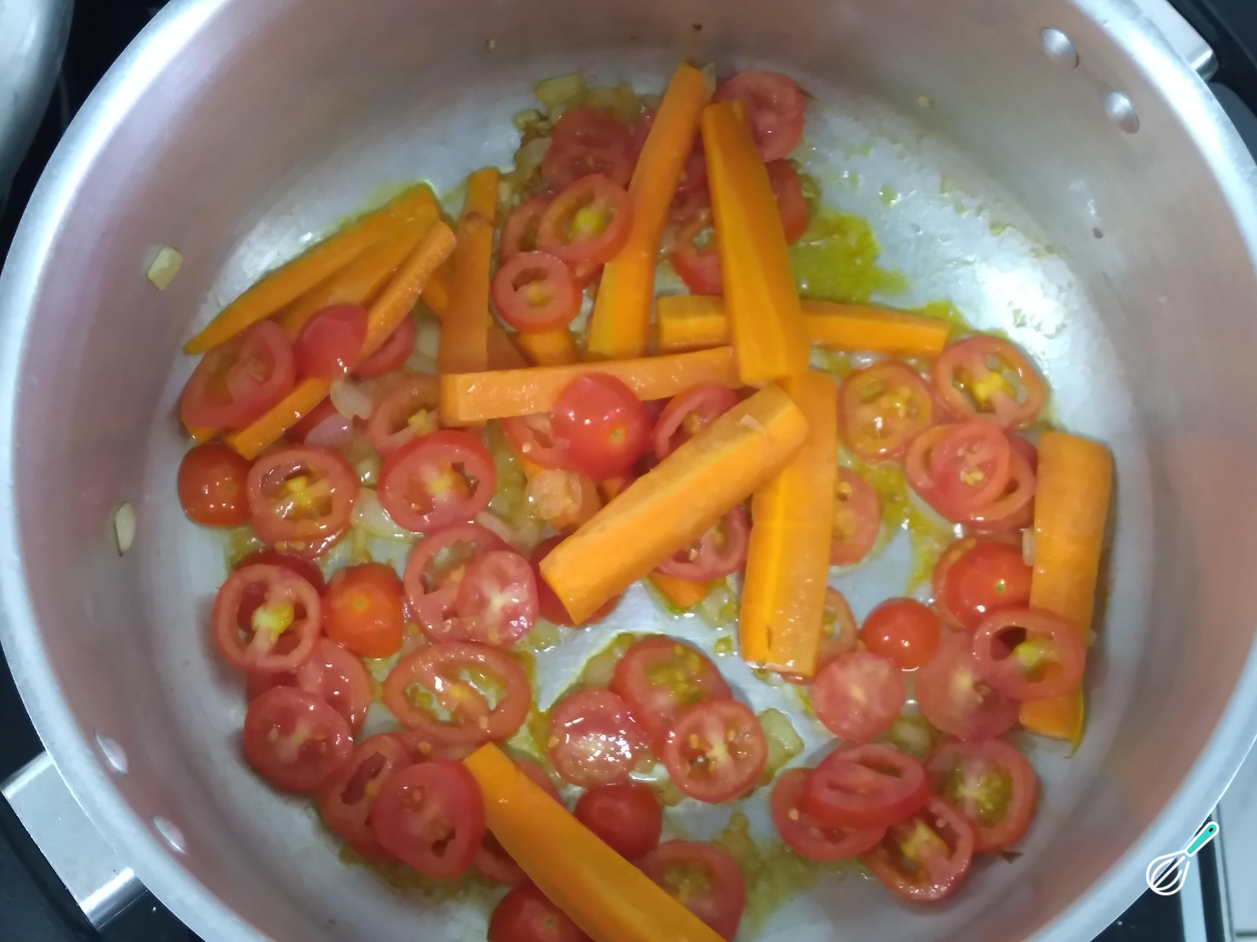 Em seguida, acrescente os tomates picados e a cenoura cortada. Mexa bem e deixe refogar. Acrescente os temperos reservados e cubra os legumes com água para cozinhar e formar um caldo. Deixe que cozinhem por um tempo.