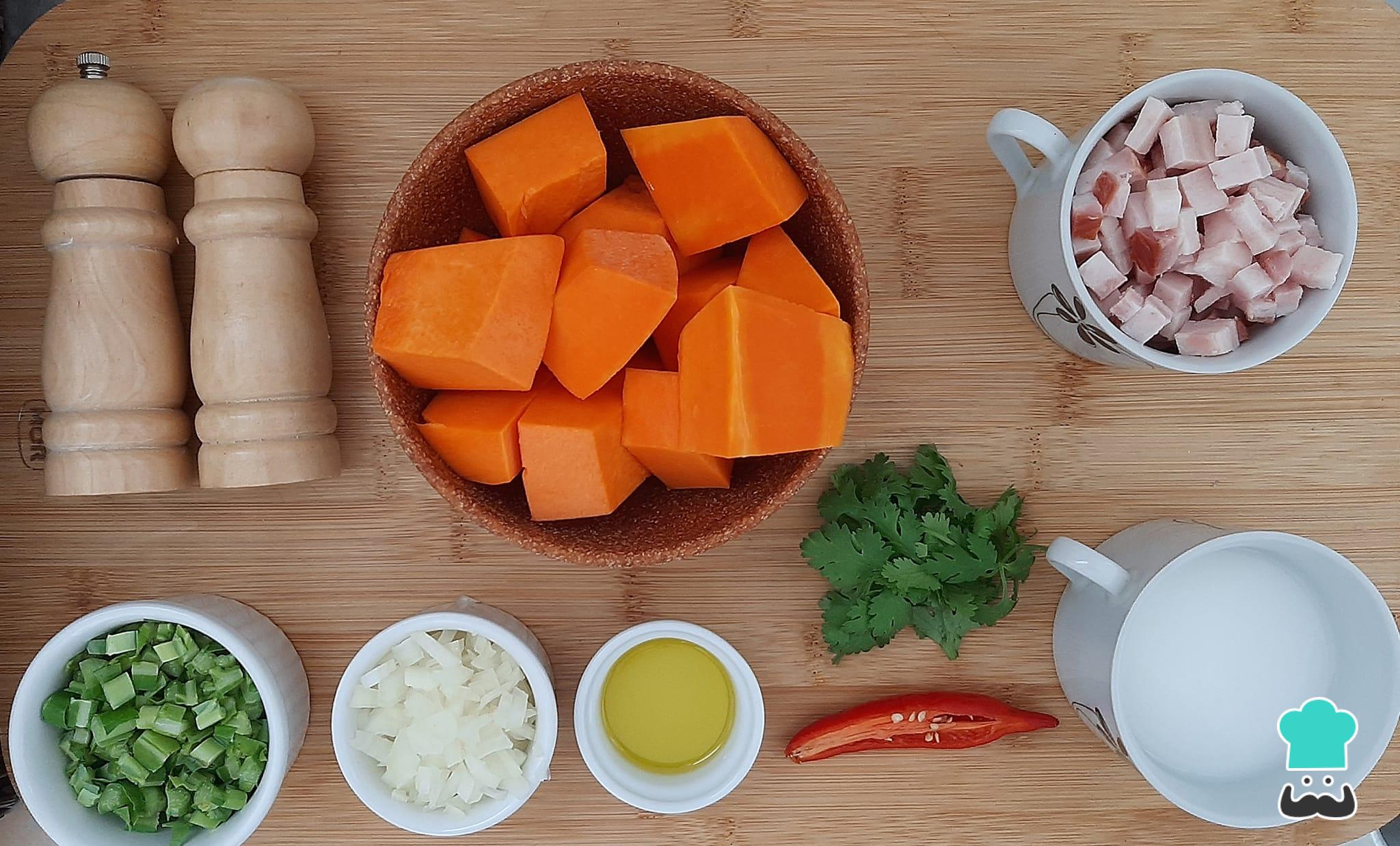 Separe os ingredientes necessários para preparar esta receita de caldo de abóbora com bacon.