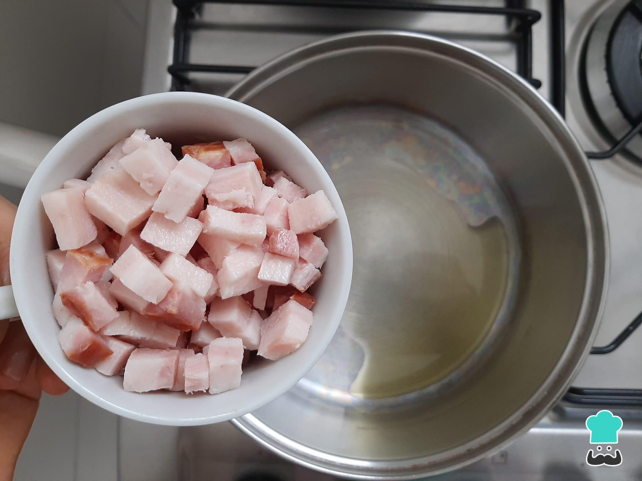 Aqueça o azeite de oliva numa panela média e acrescente o bacon picado.