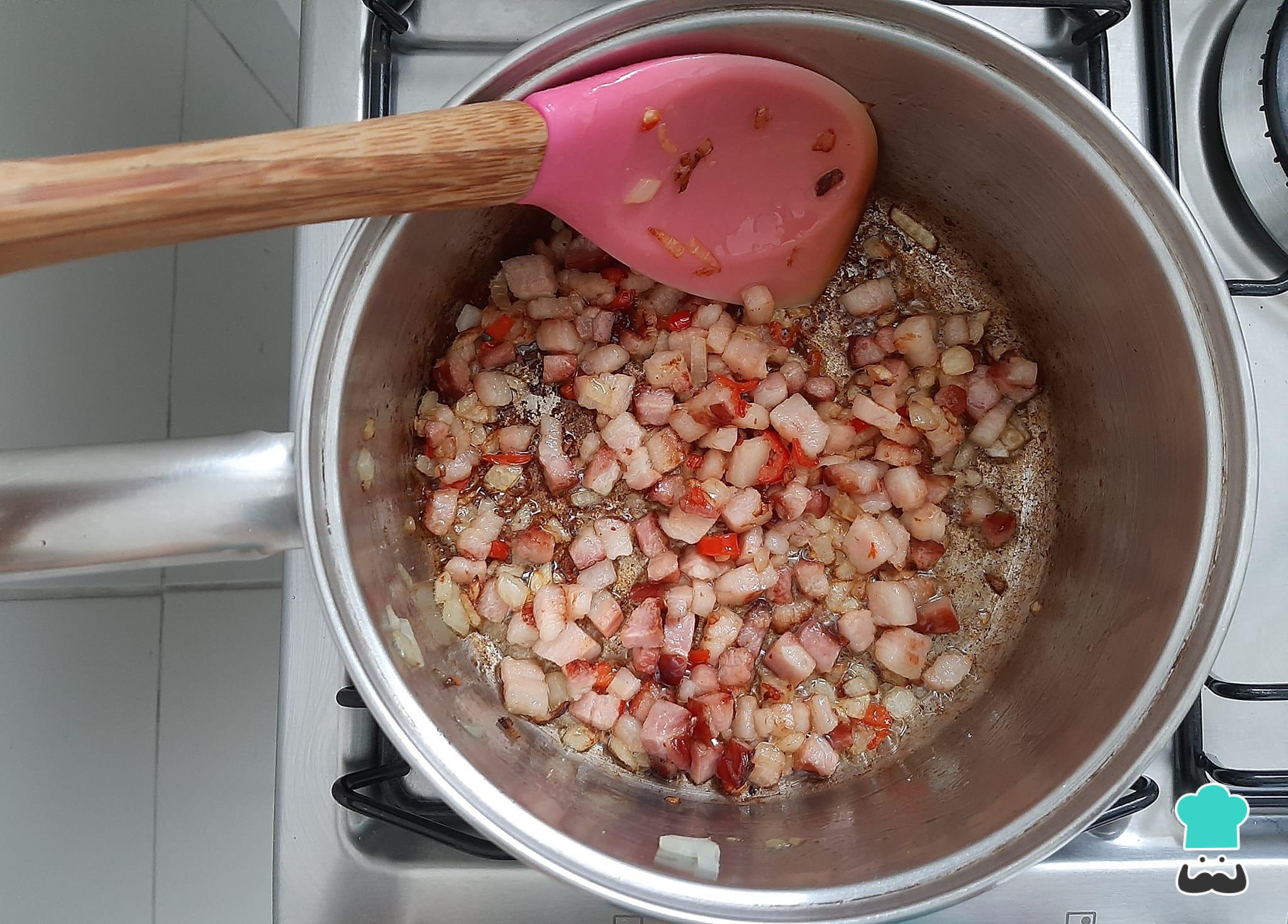 Adicione a cebola e a pimenta picada e refogue tudo até que o bacon esteja dourado.