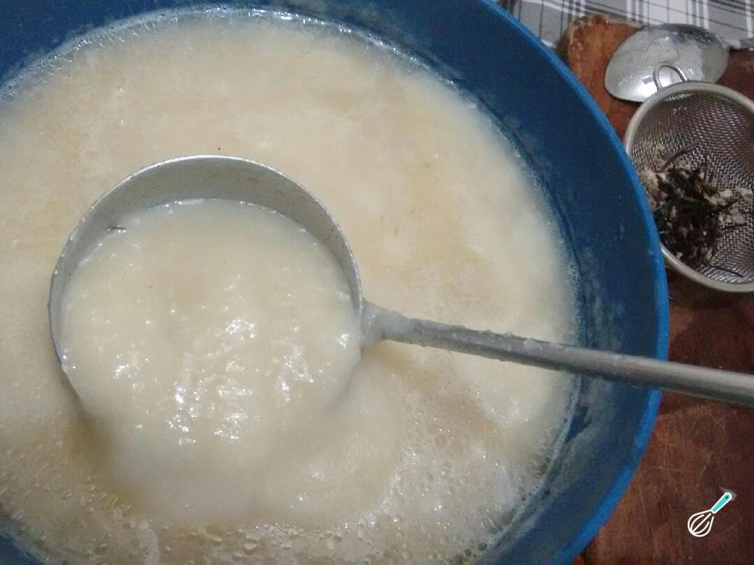Cozinhe a mandioca descascada numa panela com água ou caldo e bata no liquidificador. Reserve.