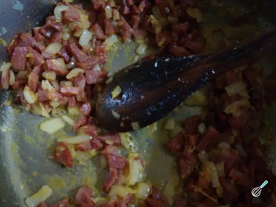 Quando a cebola estiver translúcida acrescentar o açafrão e a calabresa, cortada em cubinhos, e deixe fritar para soltar a gordura e o sabor.