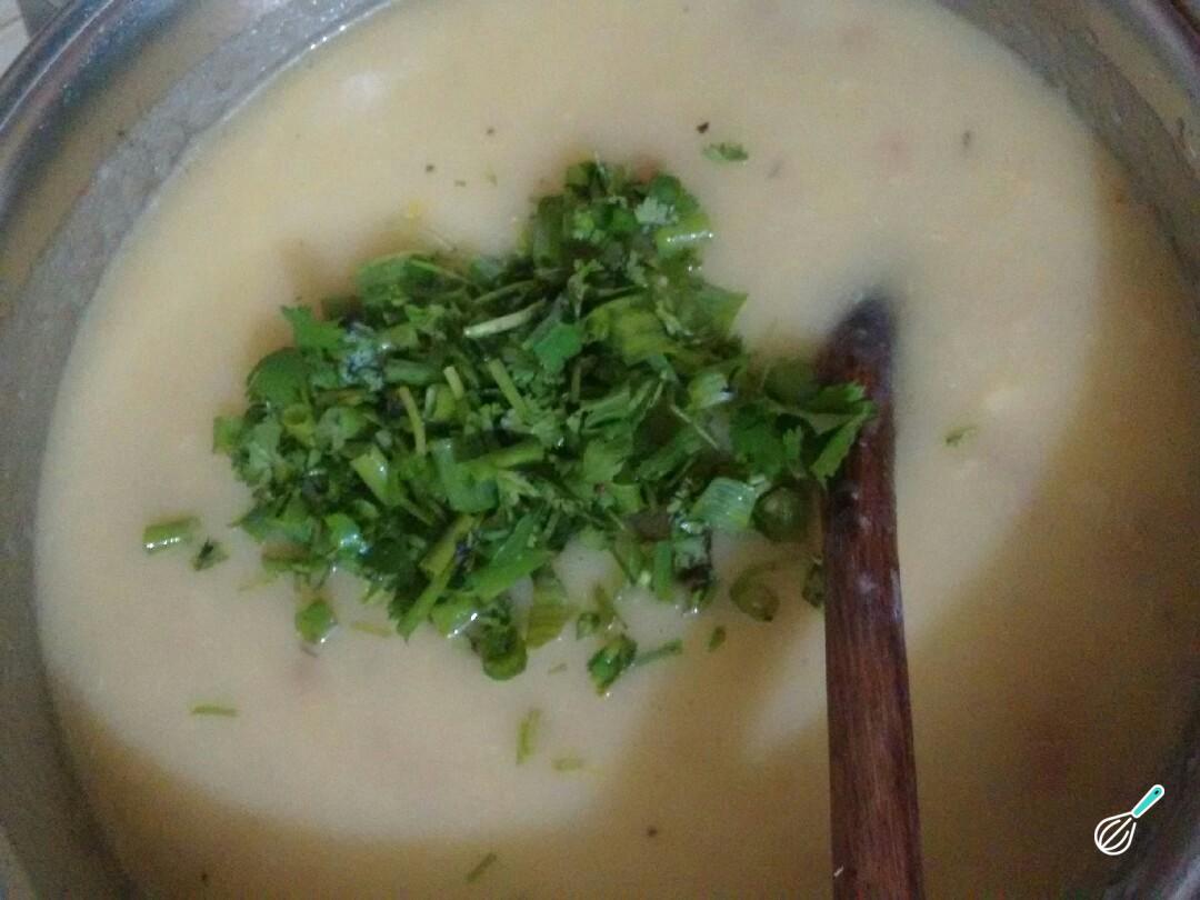 Quando a calabresa estiver no ponto, acrescente a mandioca batida. Dissolva o tablete de caldo de carne em um pouco água morna e acrescente também. Por fim adicione o cheiro verde, acerte o sal e espere ferver.