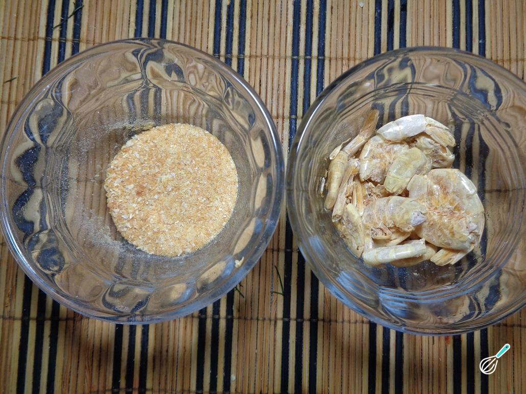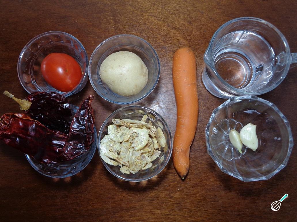 Poderá verificar na imagem abaixo os ingredientes necessários, para este caldo de camarão seco com verduras.