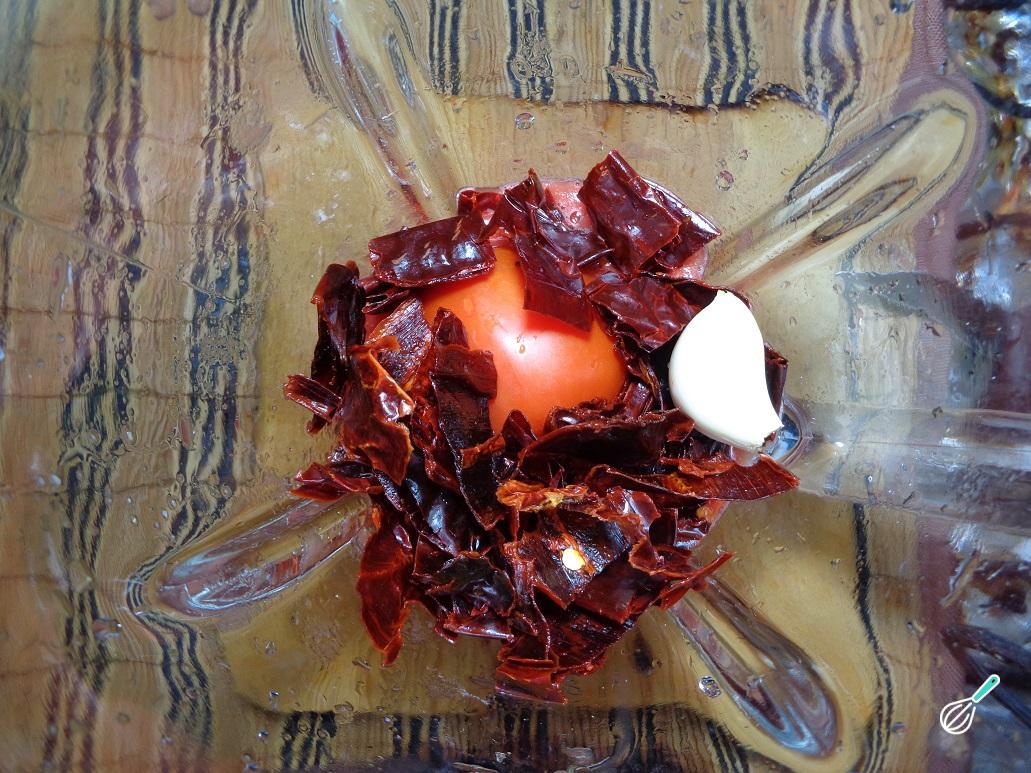 Depois dos tomates cozidos, coloque-os em um liquidificador, junte a pimenta calabresa, o alho e triture bem.