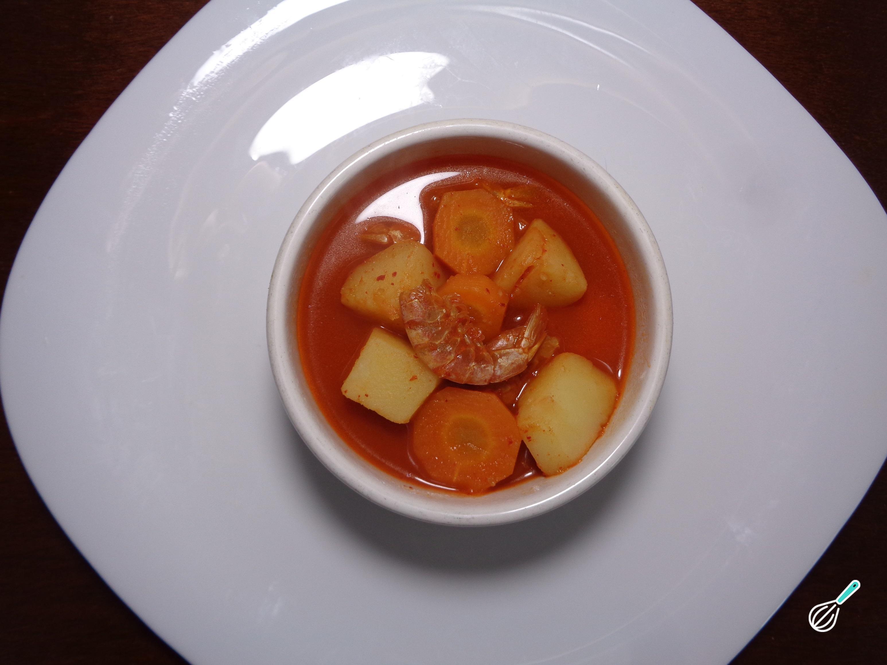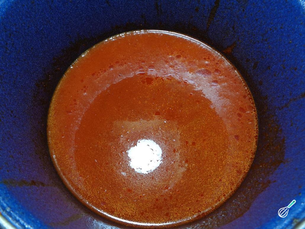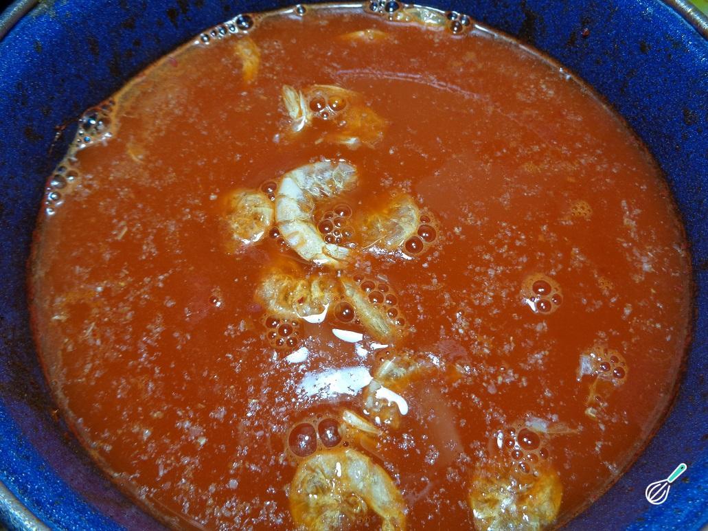 Depois caldo de tomate ferver, adicione o camarão seco inteiro, o camarão moído, as cenouras, as batatas, tempere com sal, pimenta do reino e deixe cozinhar em fogo baixo por uma hora.