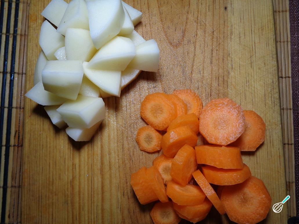 Descasque as cenouras, as batatas e corte-as em pedaços pequenos. Reserve.