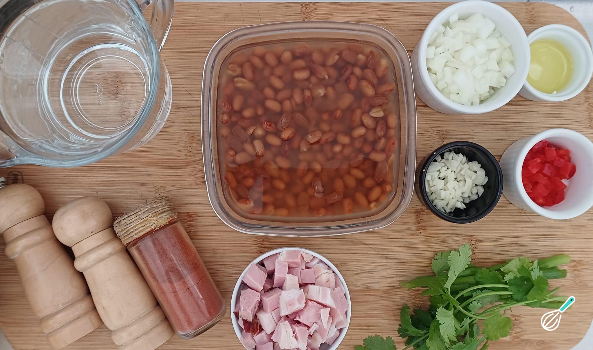 Separe todos os ingredientes necessários para o preparo da receita de caldo de feijão com bacon.