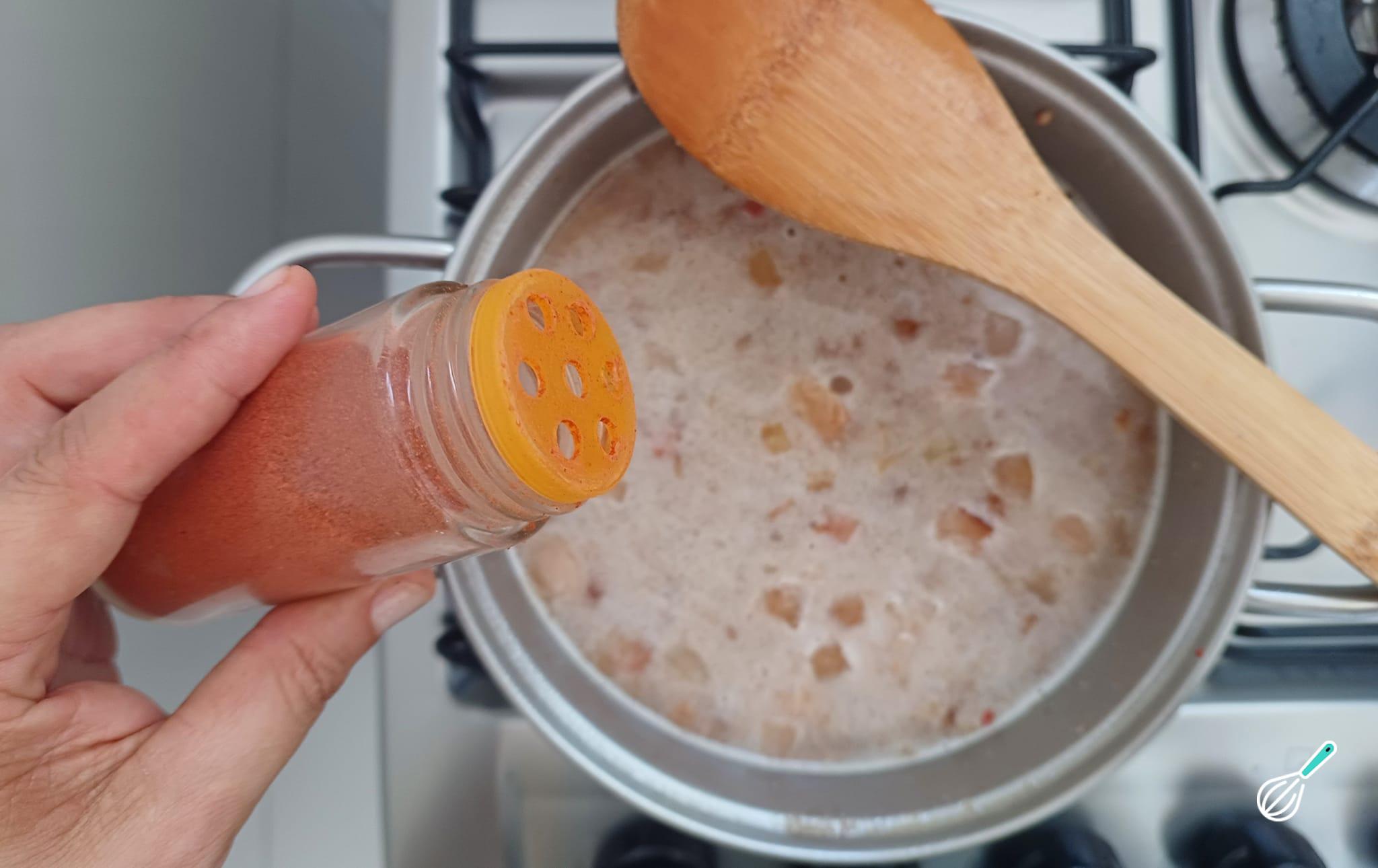 Junte o feijão batido e a água (500 ml), tempere com sal, pimenta-do-reino e páprica.