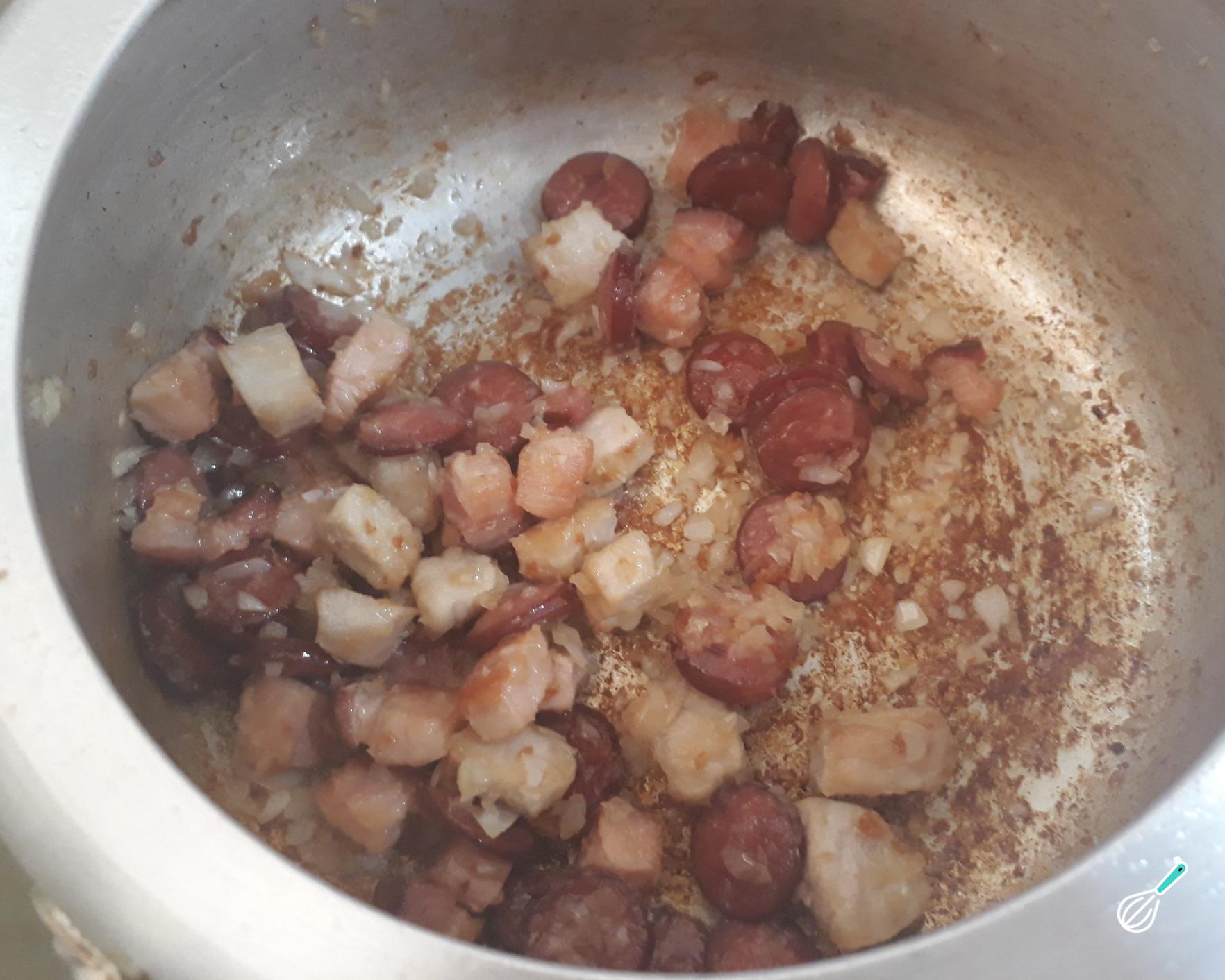 Leve ao fogo uma frigideira com o óleo e frite a linguiça, o bacon, as cebolas e os alhos até começarem a dourar. Depois coloque o feijão batido no liquidificador e acrescente água a gosto até conseguir um caldo de feijão com a consistência da sua preferência.
