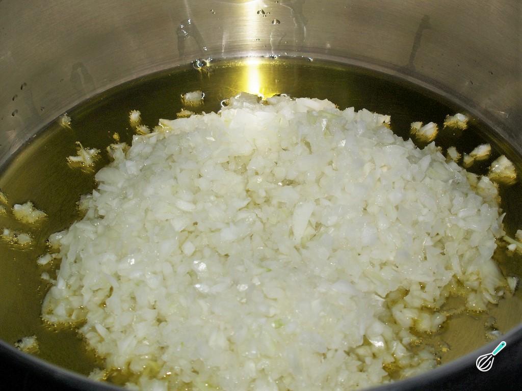 Para começar a receita de caldo de frango cremoso, comece refogando a cebola e o alho no azeite até a cebola dourar.