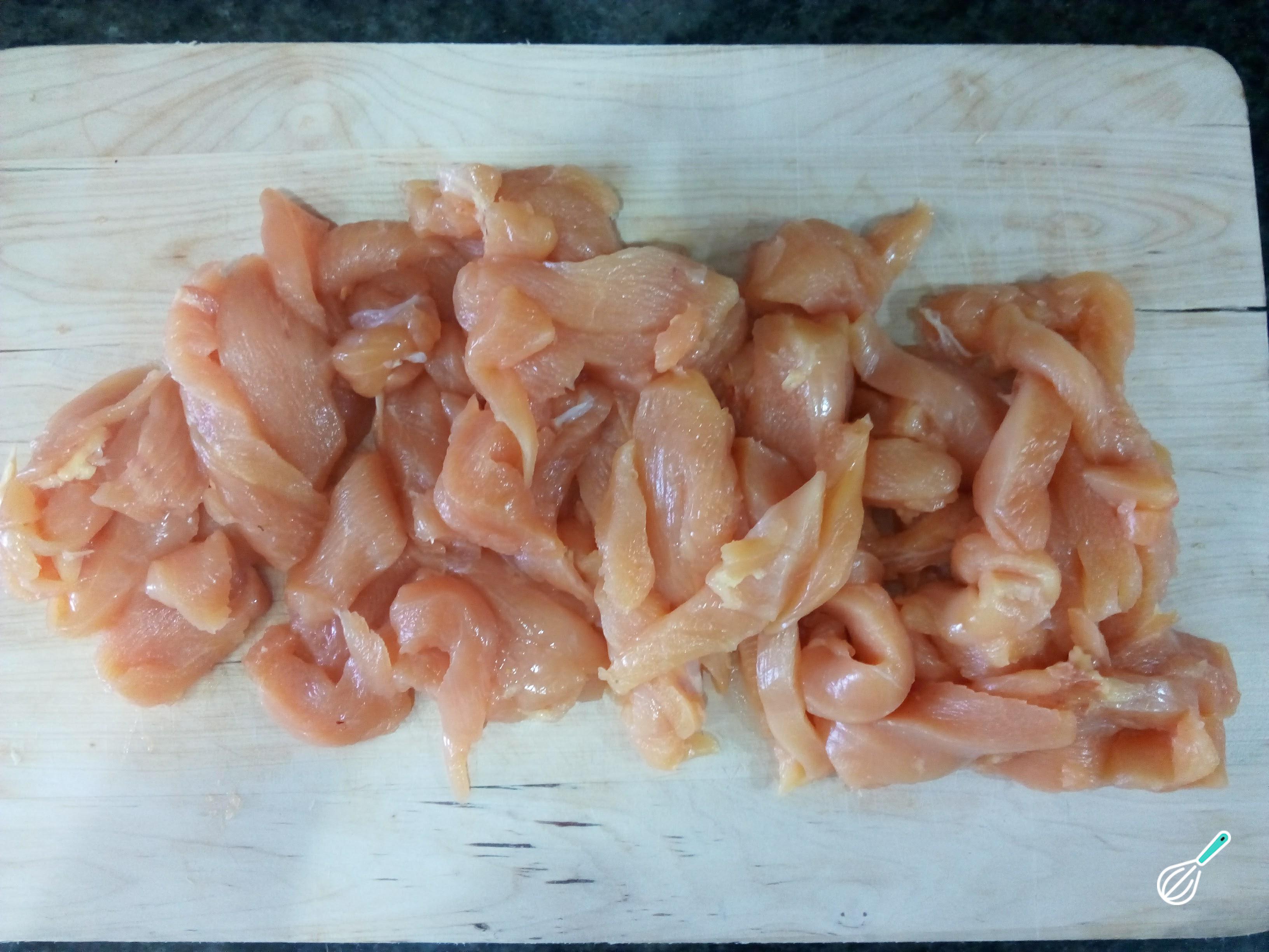 Quando a cebola estiver dourada, junte a mandioca batida, o colorau e o frango cortado e deixe refogar. Quando estiver bem refogado, junte a água (se ficar muito espesso, junte mais água) e deixe ferver (aproximadamente 20 a 25 minutos).