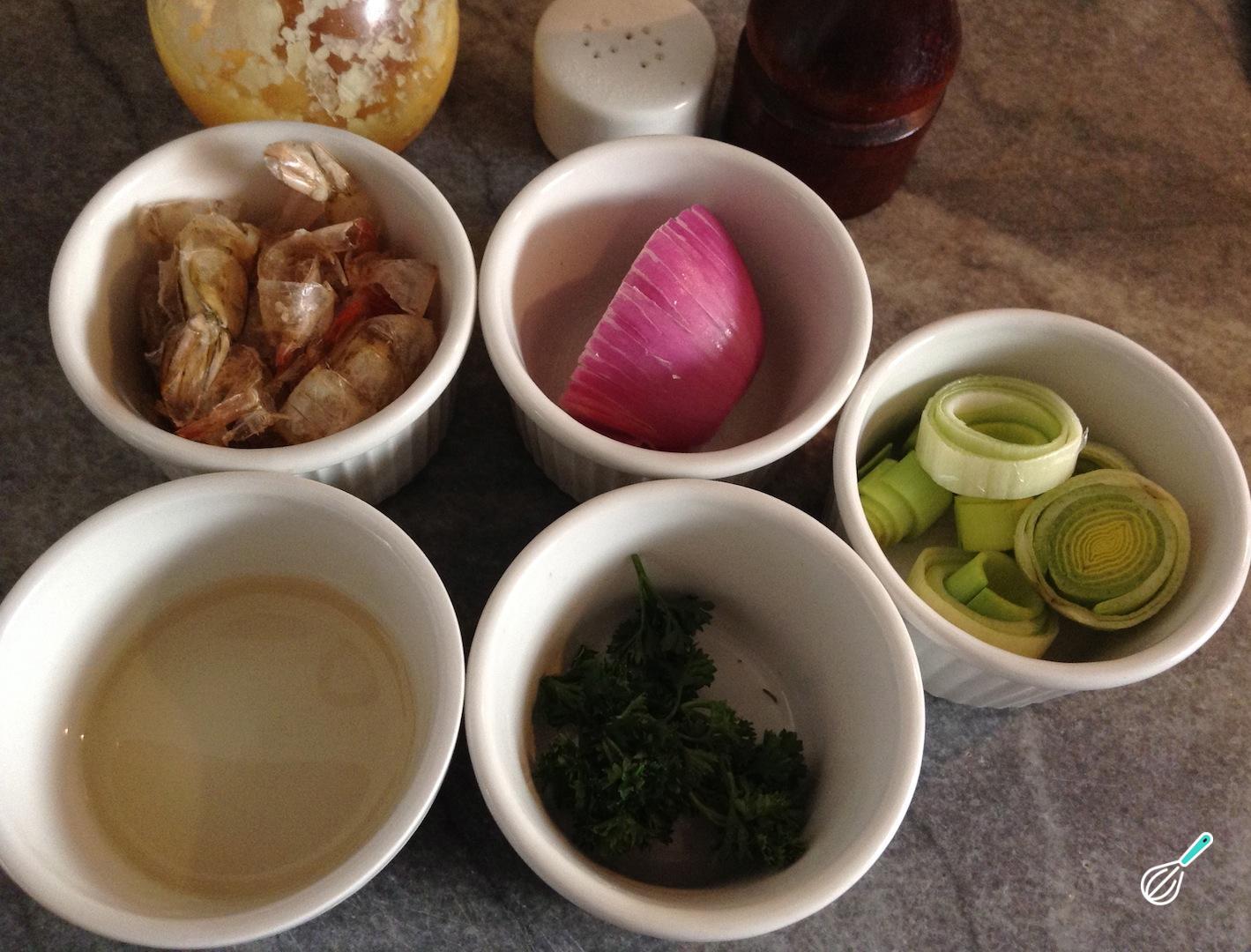 Para preparar esta receita de caldo de frutos do mar, comece por reunir os ingredientes.