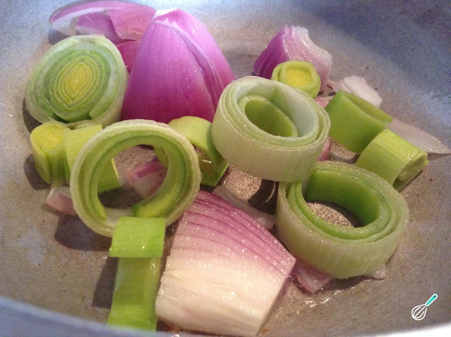 Em seguida salteie a cebola e o alho-poró cortados em pedaços, numa panela com o azeite de oliva. Tempere com sal e pimenta a gosto.