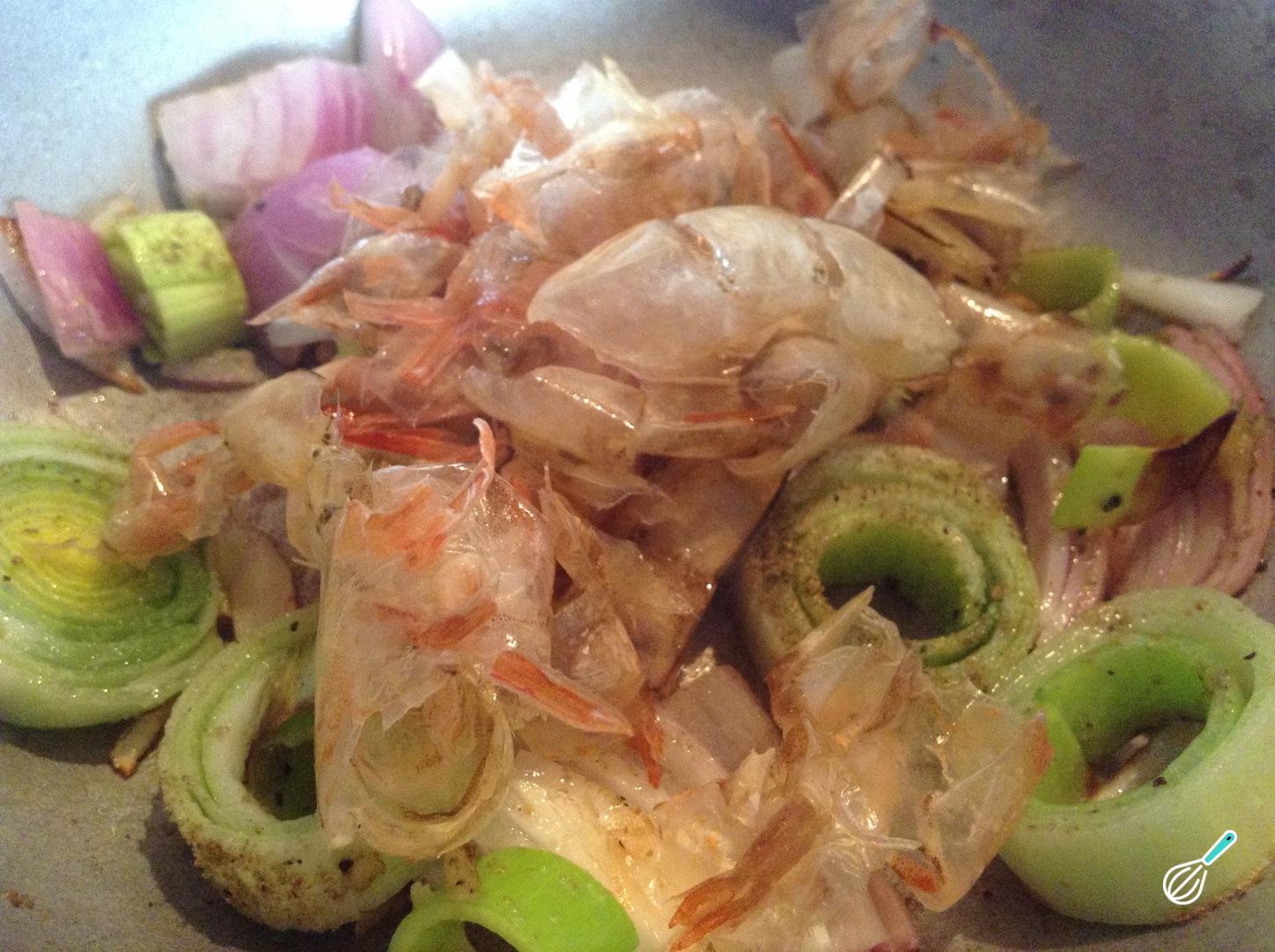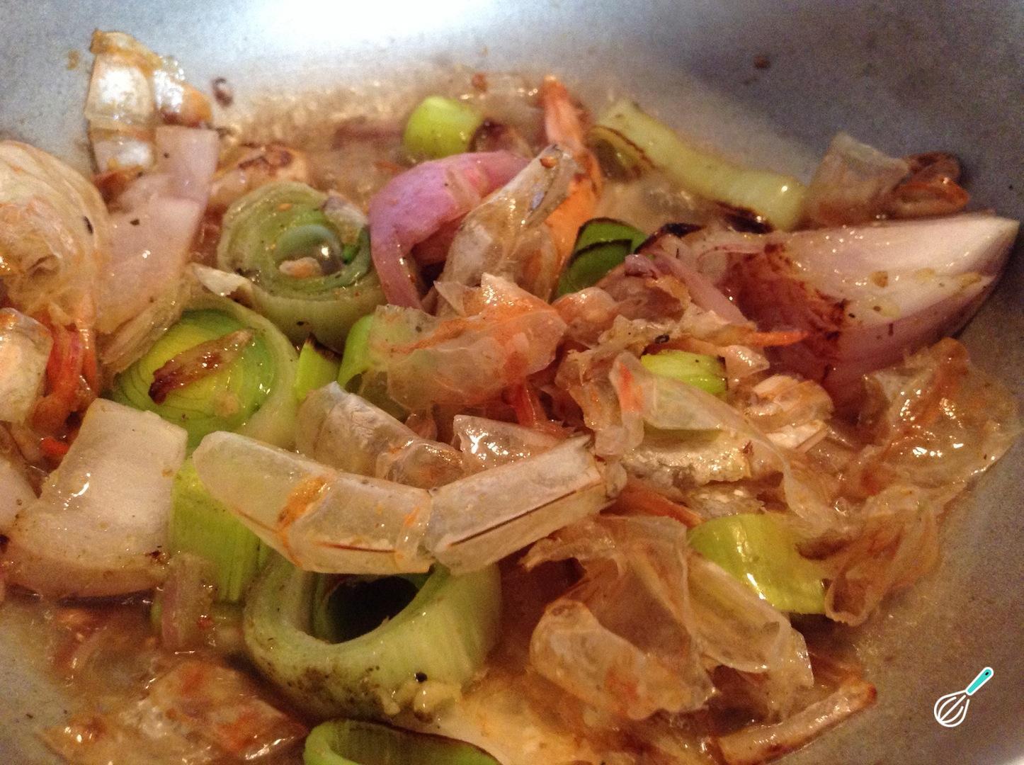 Quando os legumes estiverem macios, acrescente as cascas e cabeças de camarão, misture tudo e deixe cozinhar por mais 1-2 minutos.