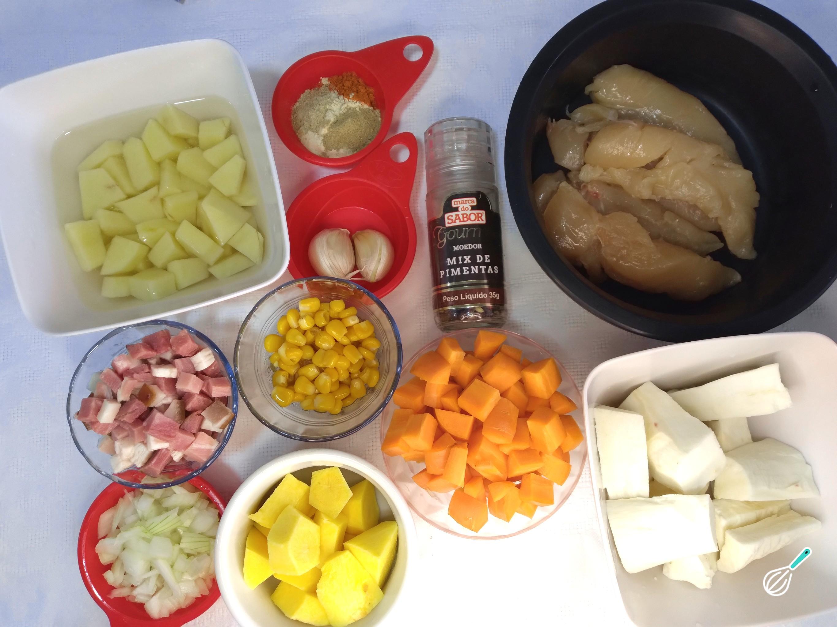 Comece separando os ingredientes. Retire a casca e corte a batata inglesa, a mandioquinha e o aipim. Corte a cebola em pequenos cubinhos. O bacon corte em pedaços pequenos e quadrados. Separe os temperos de sua preferência. Separe os filés de peito de frango.
