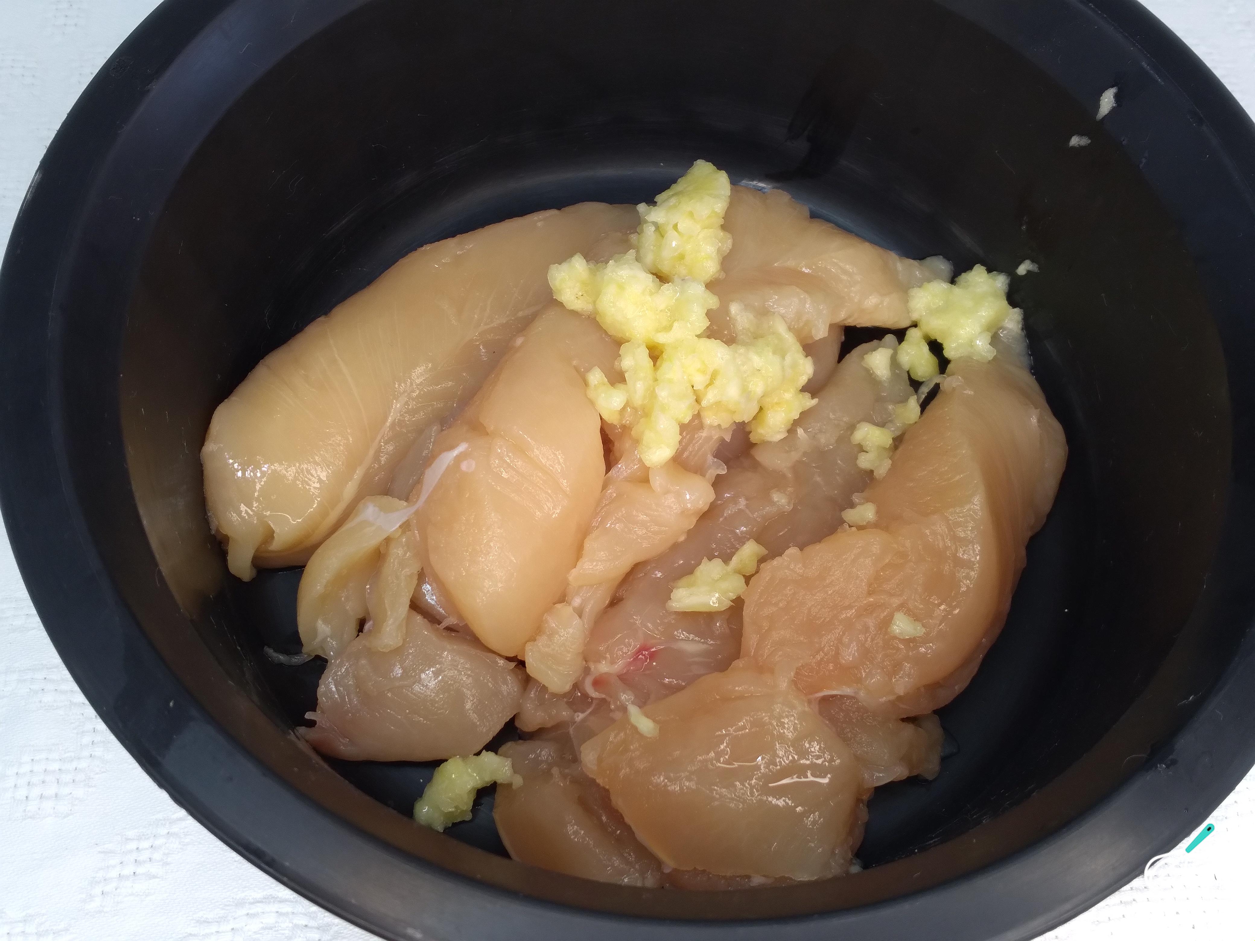 Em uma tigela, coloque o frango acrescente sal, a pimenta moída na hora. Descasque o alho, triture ou rale. Acrescente ao frango. Misture bem.