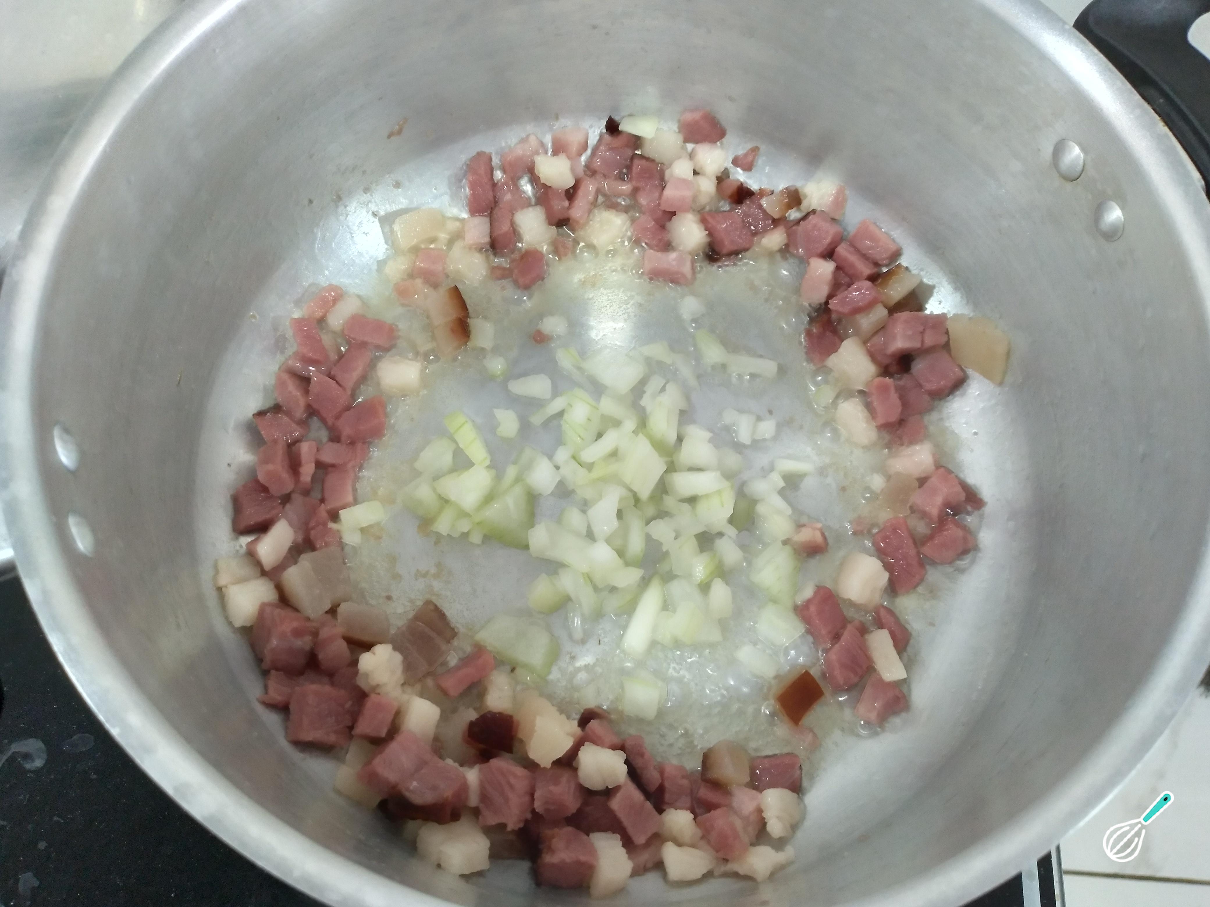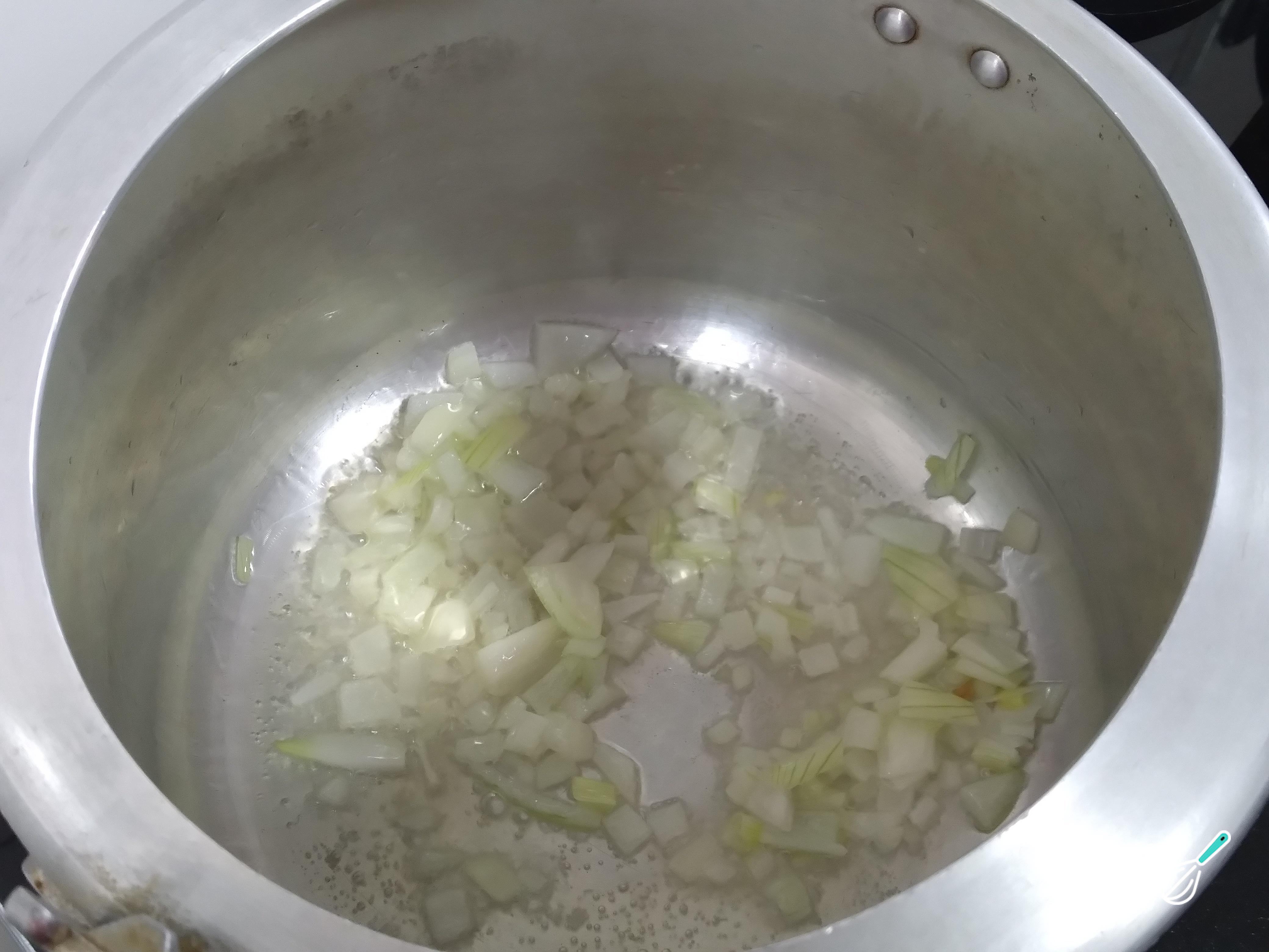 Na panela de pressão, acrescente um pouco de óleo de soja e coloque a cebola para refogar. Reserve um pouco de cebola. Deixe que ela solte líquido. Mexa bem.