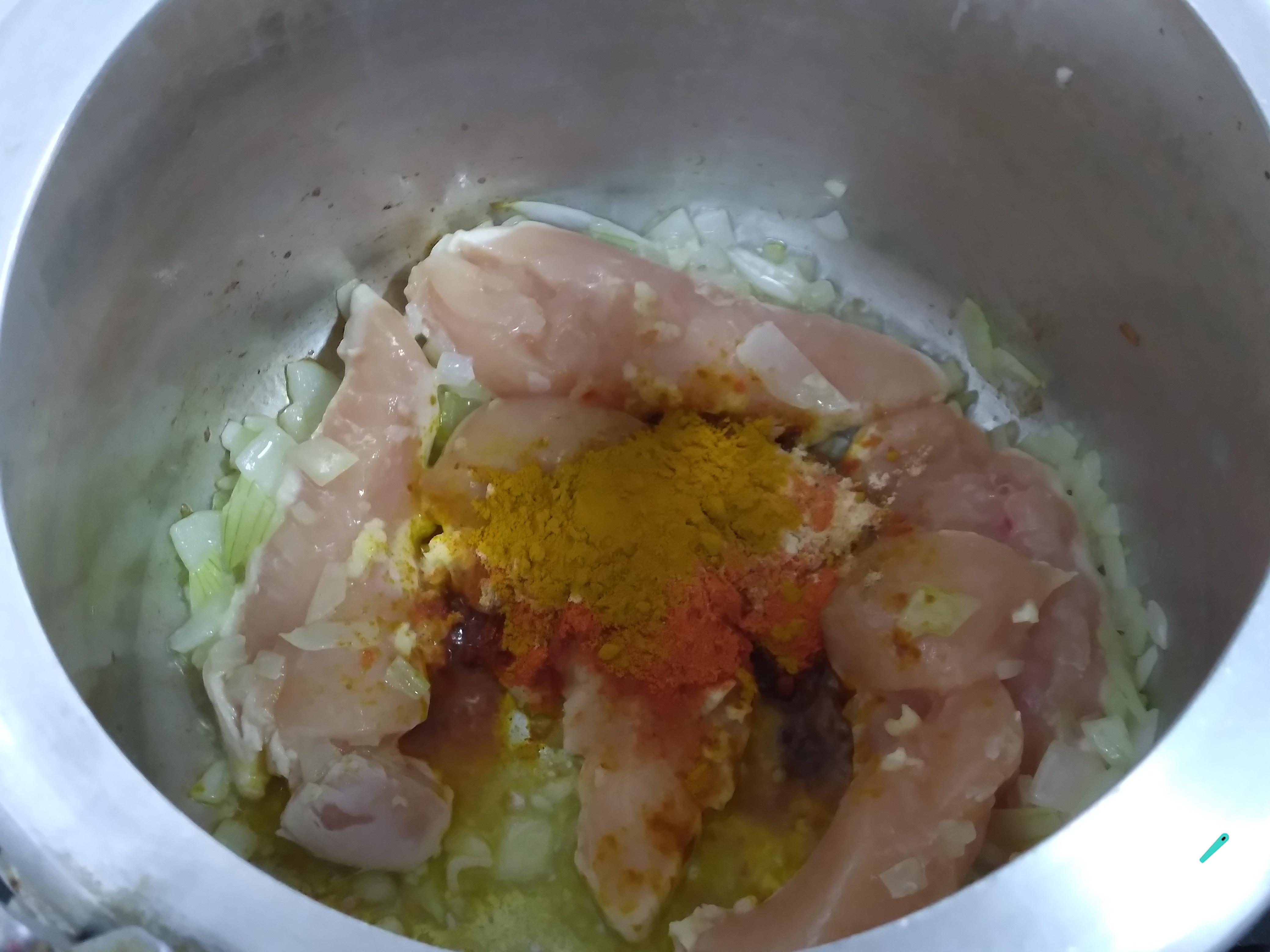 Depois de refogar a cebola, acrescente os filés de peito de frango e os temperos de sua preferência. Mexa e deixe refogar. Deixe que absorva o sabor dos temperos.