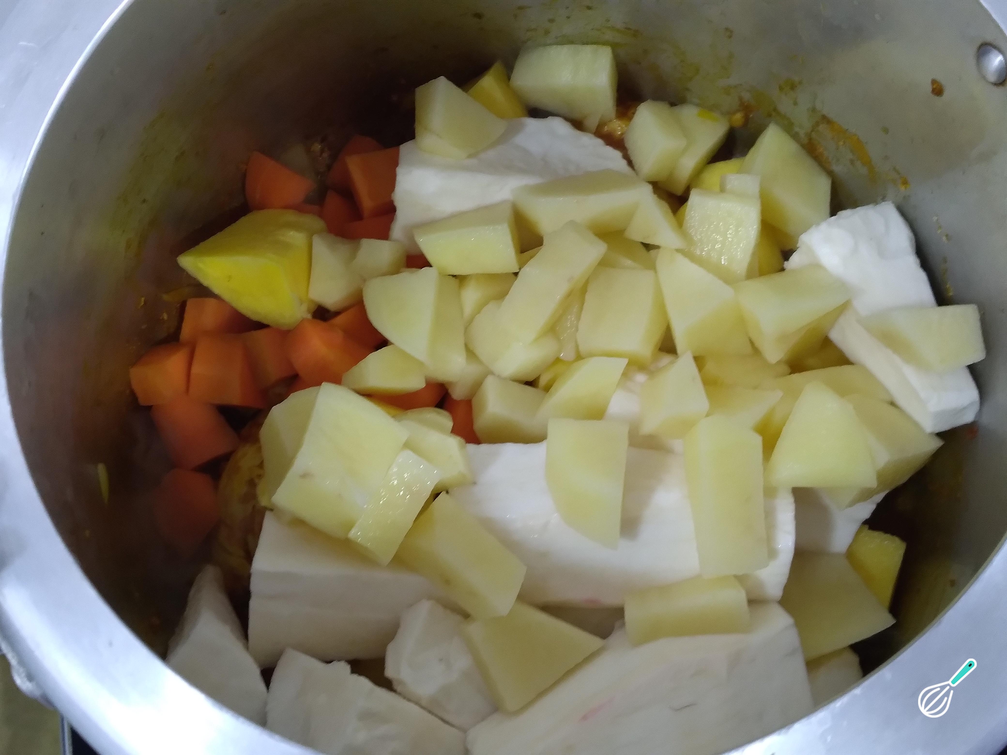 Acrescente a mandioquinha, a batata inglesa, a mandioca e mexa com a colher de pau. Cubra com água, tampe a panela de pressão e mantenha o fogo de médio para alto. Assim que pegar pressão marque 30 minutos.