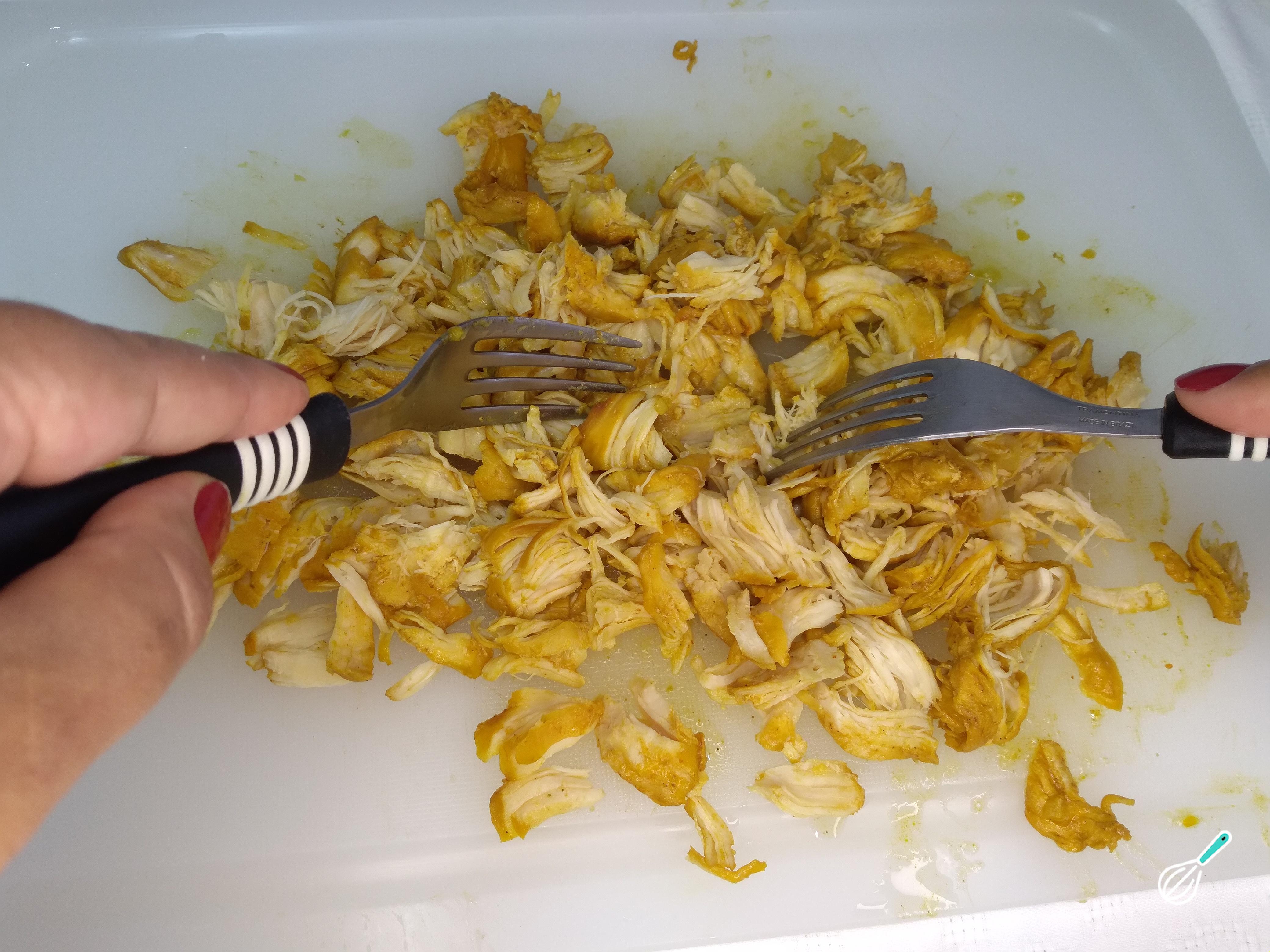 Depois dos 30 minutos, desligue o fogo e deixe a pressão sair. Abra a panela e retire o frango e desfie.