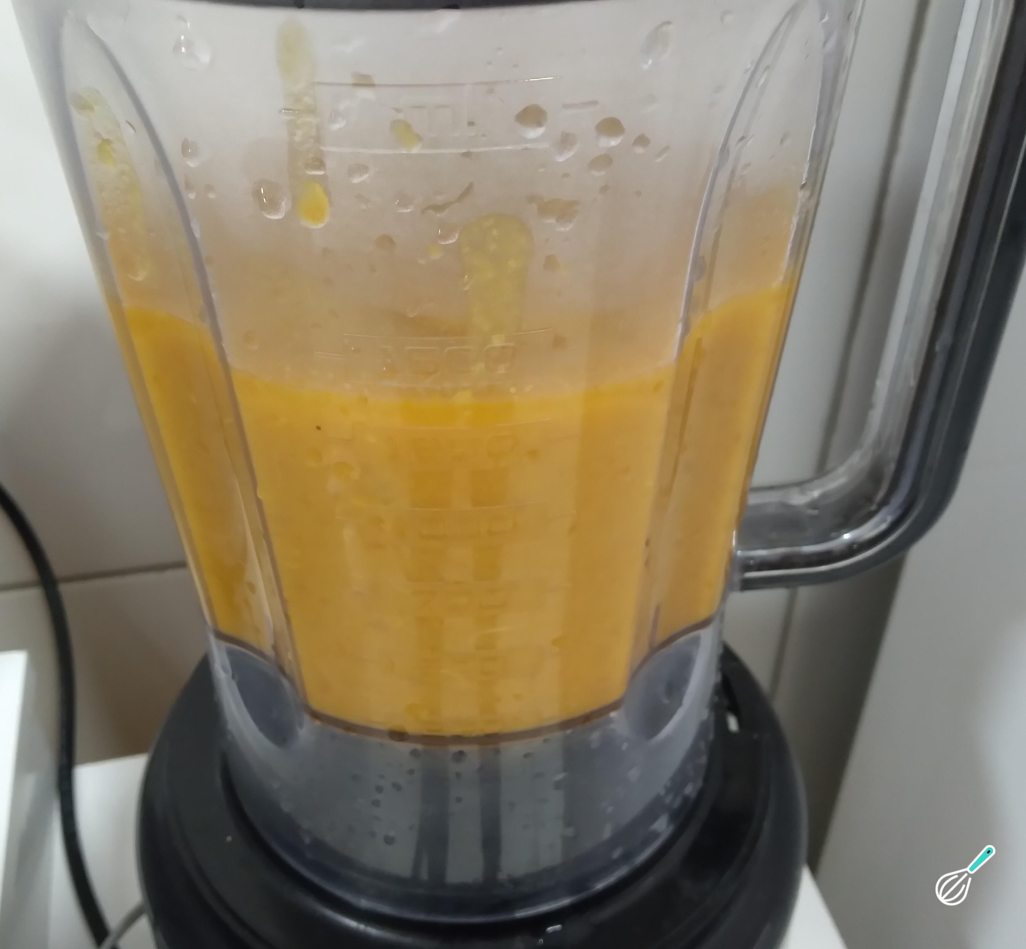 Transfira o conteúdo da panela para o liquidificador e bata até ficar bem homogêneo. Reserve. Use a velocidade média do liquidificador.