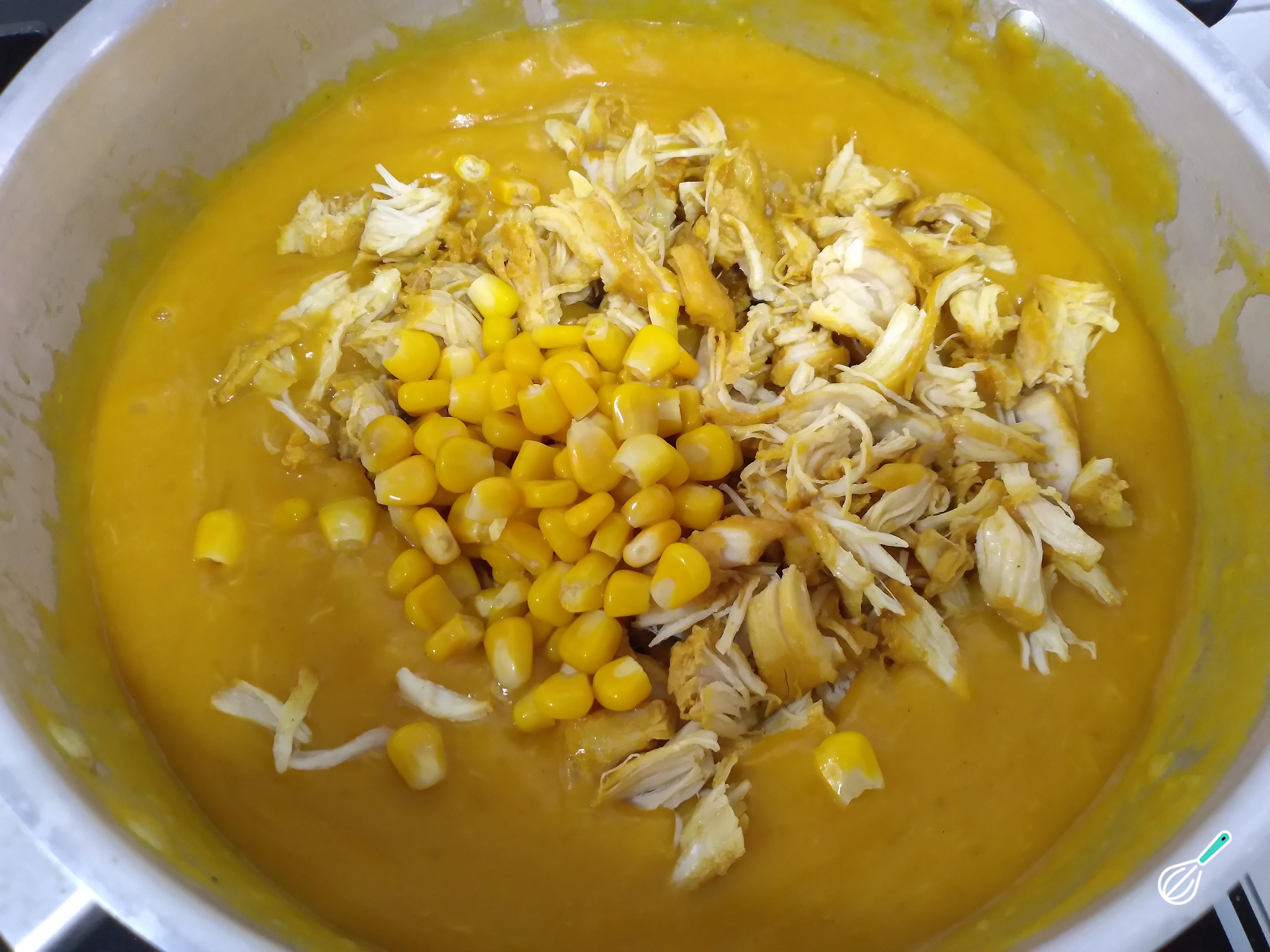 Transfira o conteúdo do liquidificador para a panela e acrescente o milho, o frango desfiado e a salsinha picadinha. Mexa bem,acerte o sal e deixe cozinhar.
