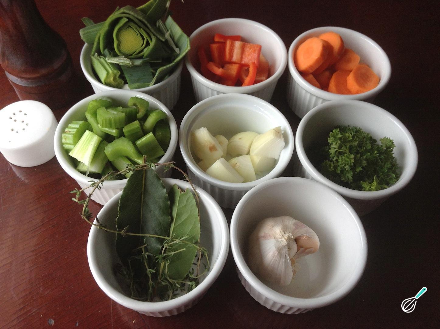 Para fazer este caldo de legumes caseiro, comece por reunir os ingredientes. Neste caso pode até usar a parte verde do alho-poró.