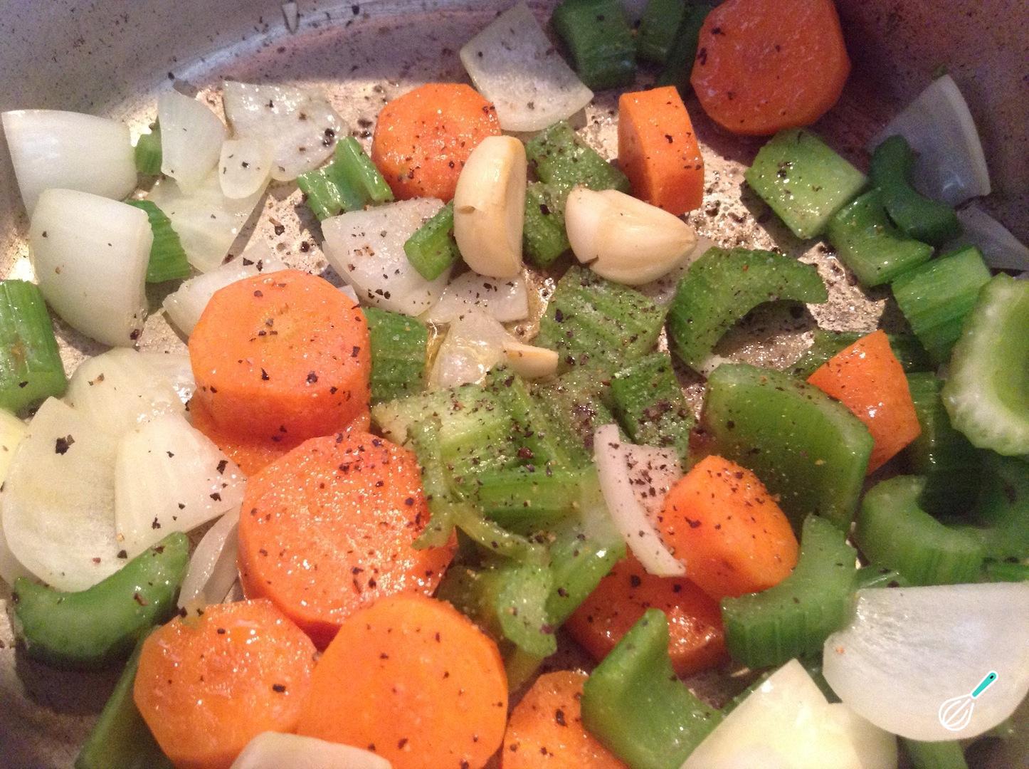 Leve ao fogo médio uma panela com o óleo e, quando estiver quente, refogue a cebola, o aipo e a cenoura em pedaços.