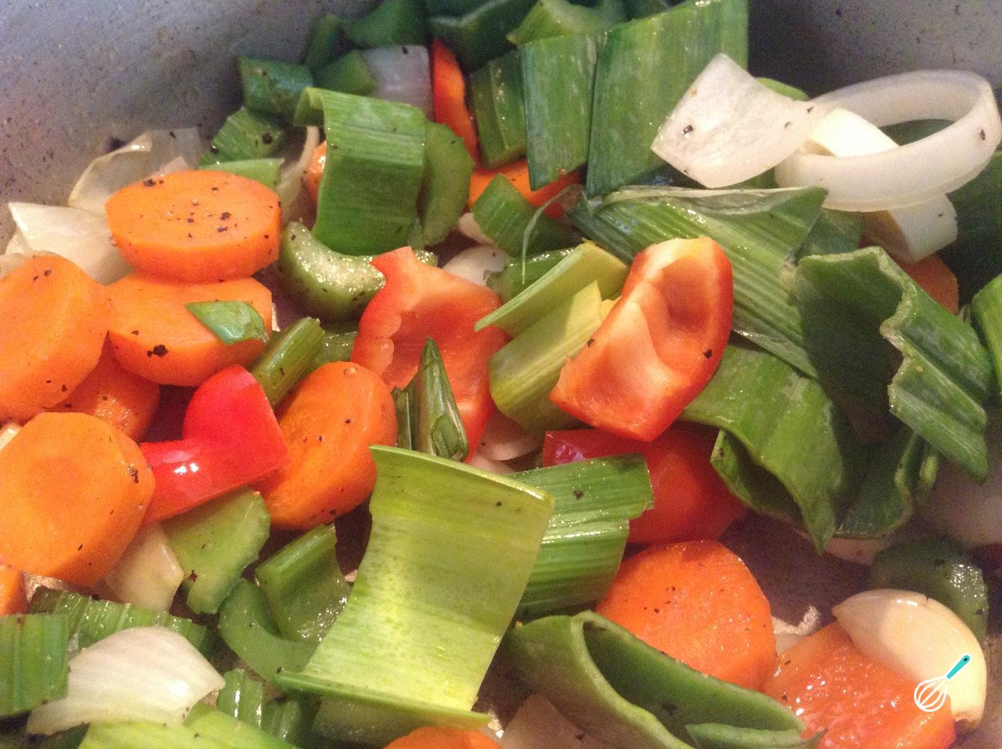 Adicione o pimentão vermelho e o alho-poró, refogue mais um pouco, e acrescente o vinho branco.