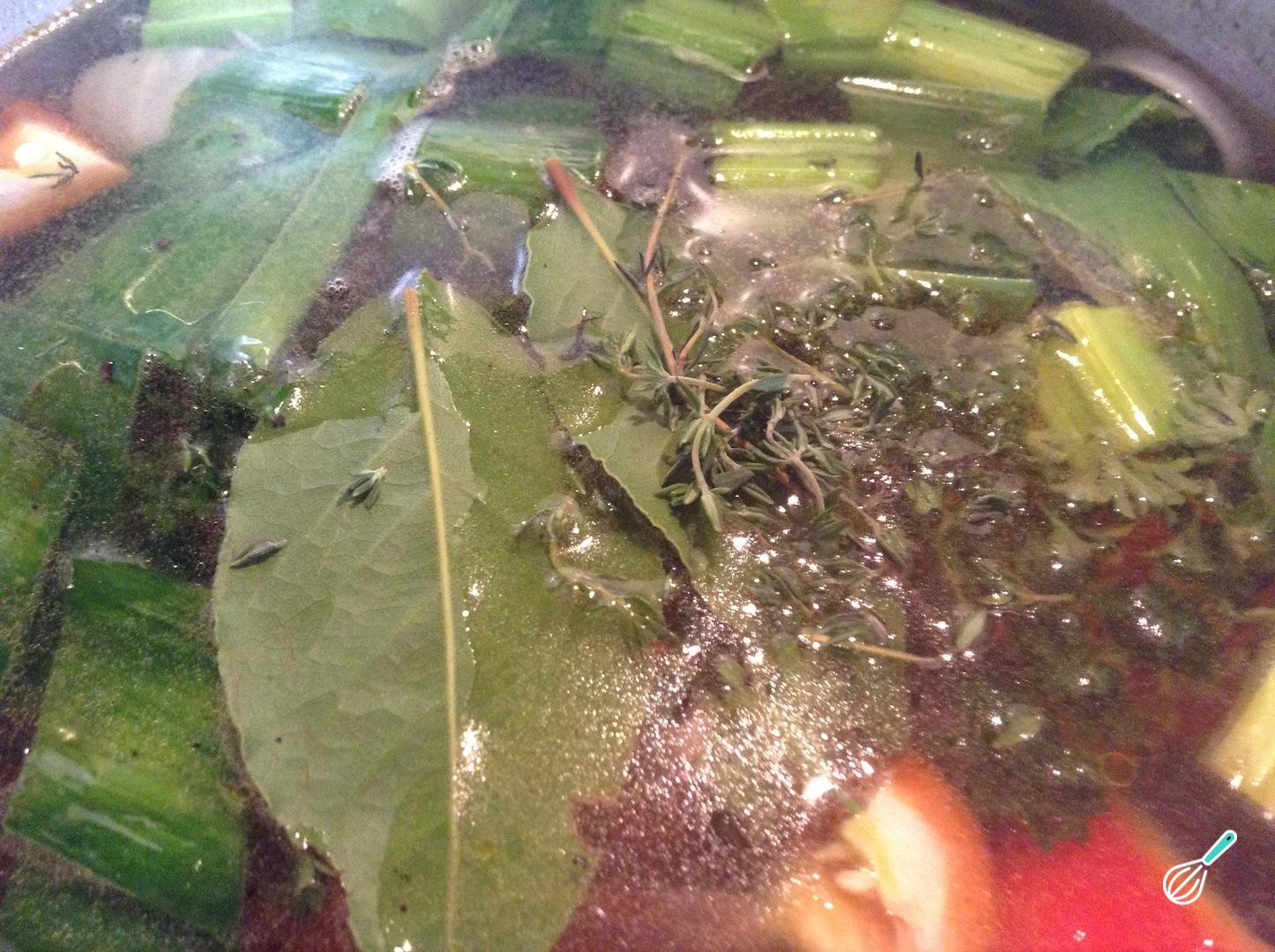 Quando o vinho evaporar, cubra os legumes com água, acrescente as ervas e cozinhe por 30 a 45 minutos, em fogo baixo.