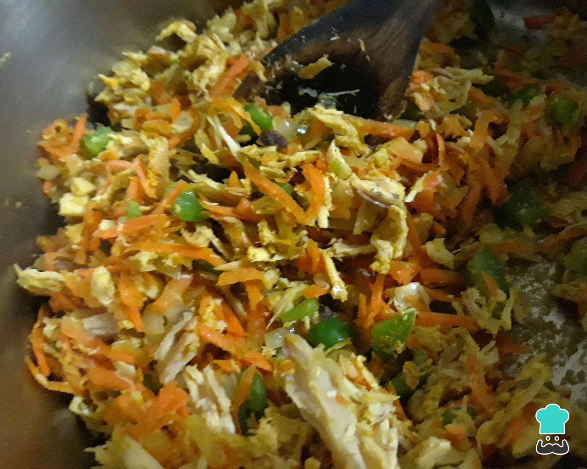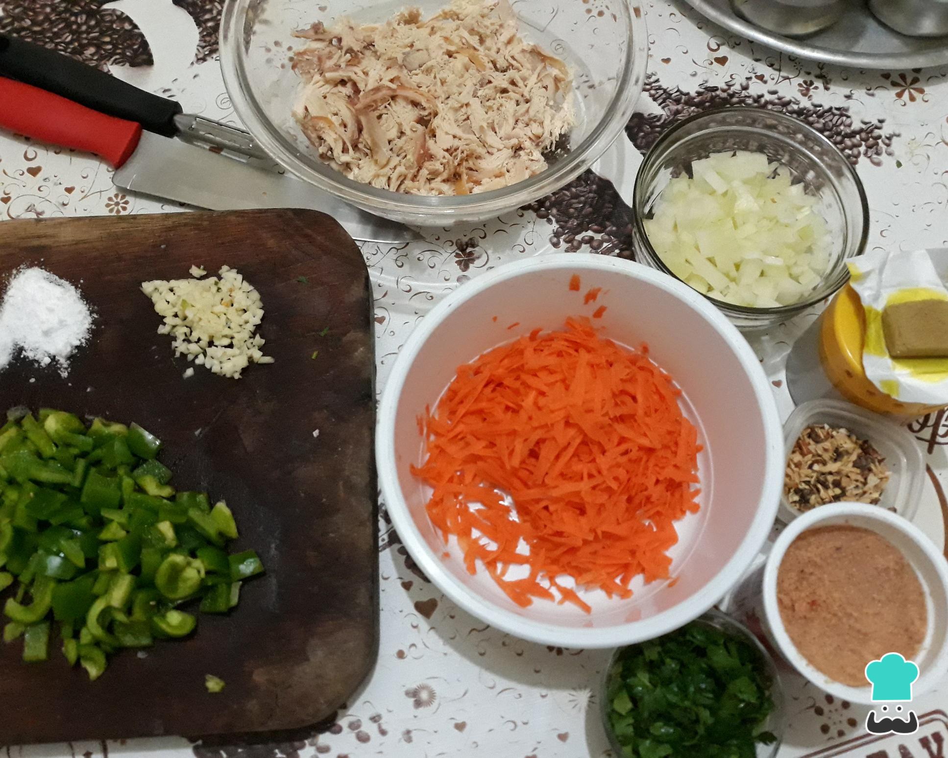 Em uma panela coloque o azeite, adicione a cebola e refogue por um minutinho. Acrescente o alho e, quando a cebola estiver translúcida, coloque o frango, a cenoura, o pimentão e os demais temperos, exceto a pimenta calabresa e a salsinha.
