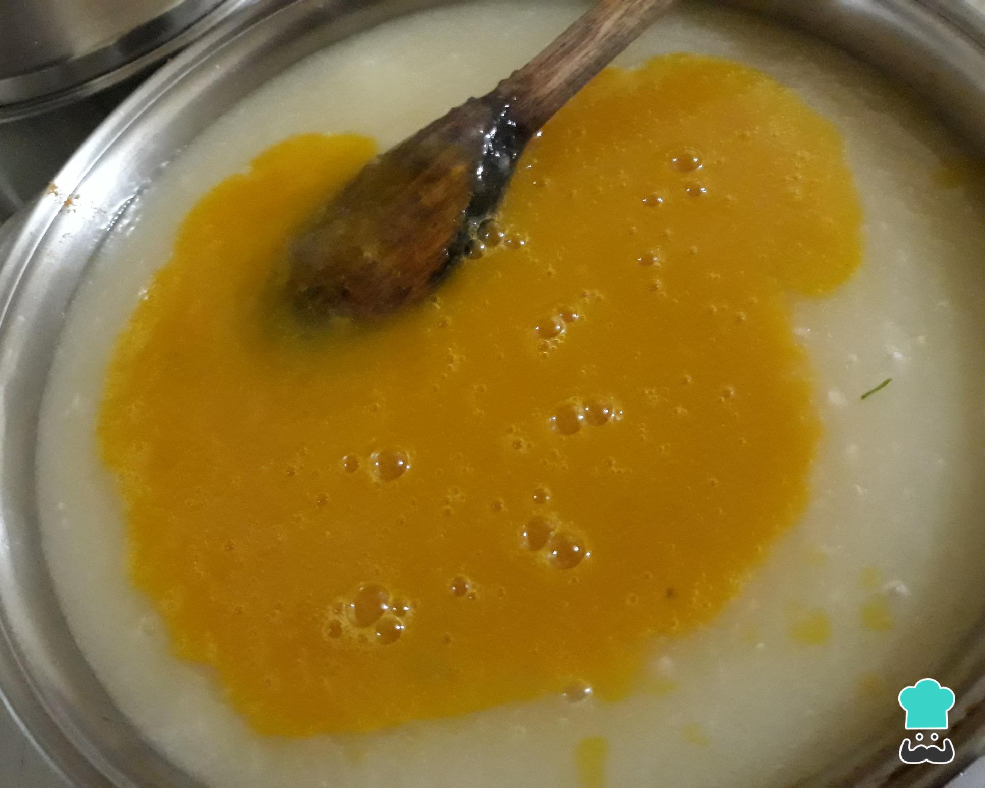 Refogue bem esses ingredientes, acrescente a mandioca e a abóbora trituradas e mexa. Coe a água do cozimento do frango e adicione na panela.