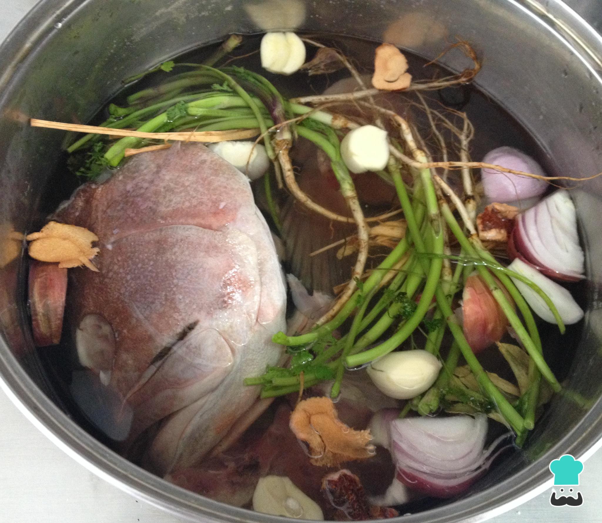 Para fazer um caldo de base, coloque em uma panela as cabeças de peixe, a galanga ou gengibre, as folhas de limão kaffir, a citronela, a cebola cortada em pedaços, o alho esmagando e os coentros inteiros (muito bem lavados). Cozinhe em fogo baixo tampado durante 40 minutos.