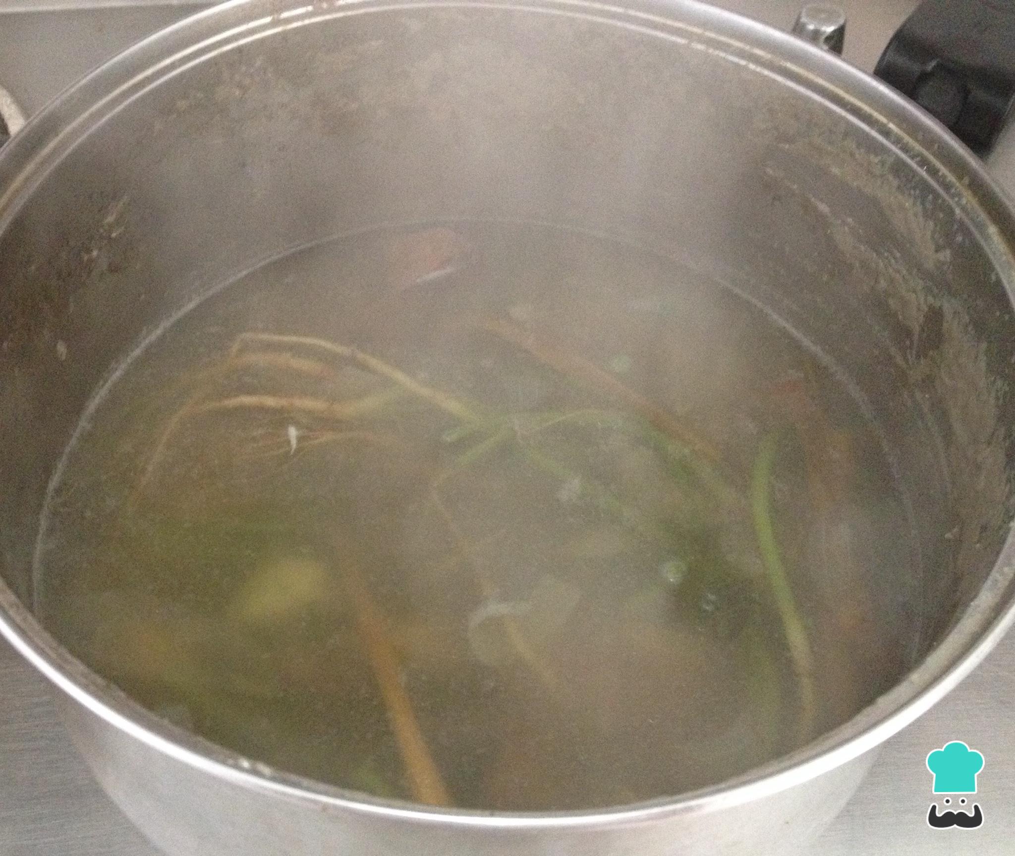 Passado esse tempo, retire as cabeças de peixe e deixe o caldo ferver por 20 minutos em fogo médio e destampado.