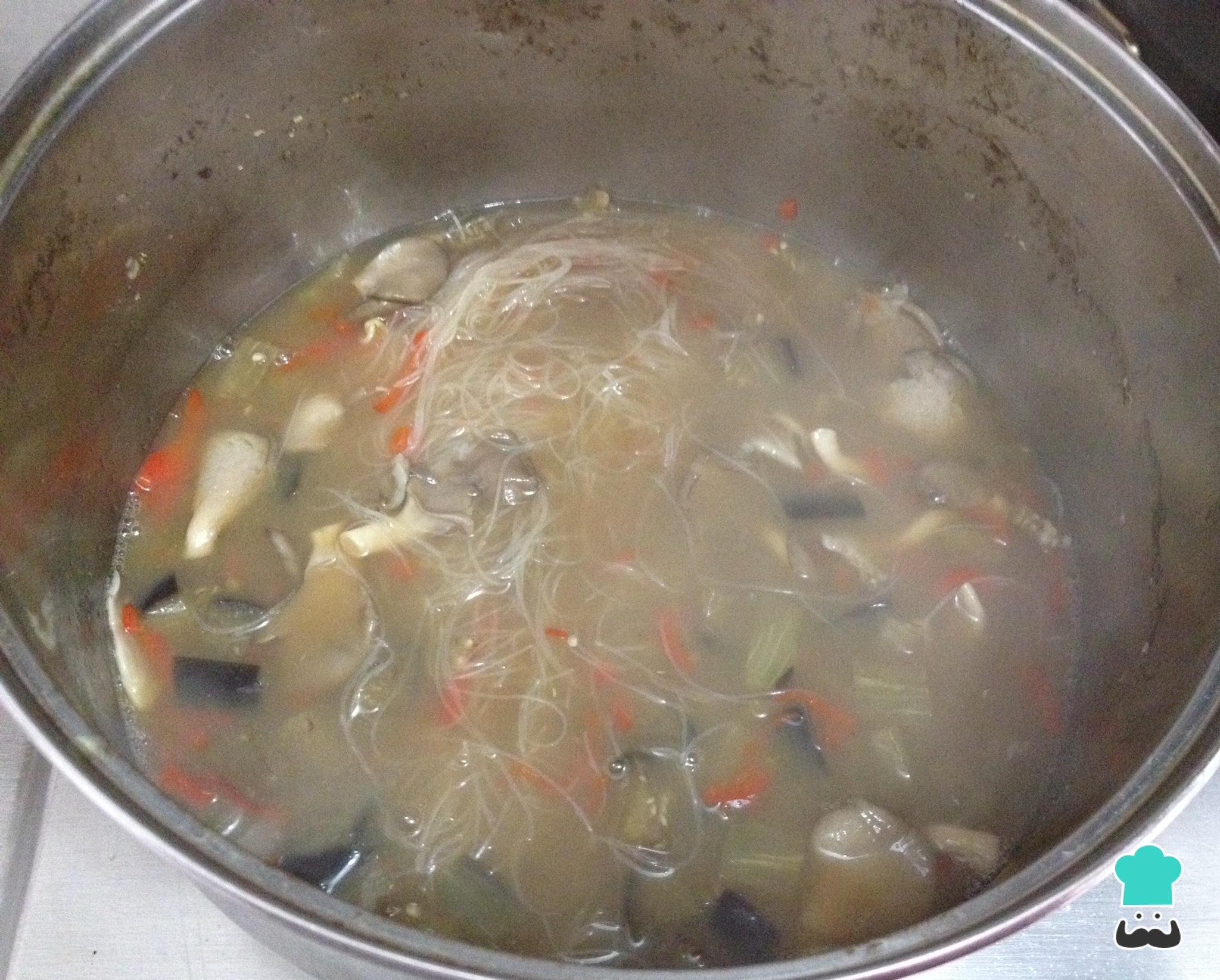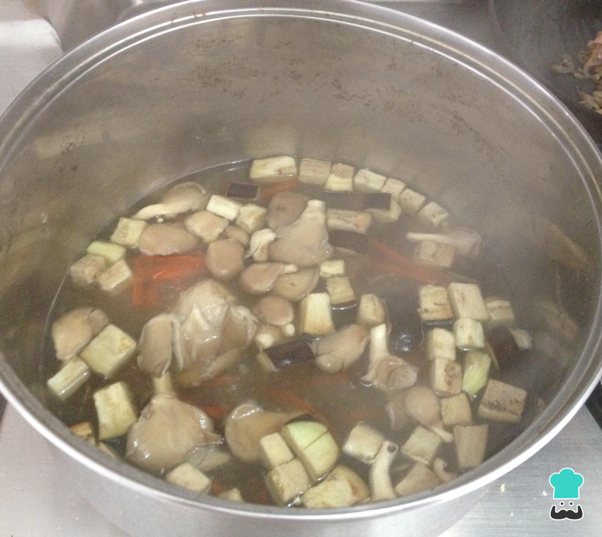 Coe o caldo e volte e levá-lo ao fogo. Adicione a berinjela cortada em cubos pequenos, o pimentão em tiras e os cogumelos. Tempere com sal e pimenta e deixe cozinhar por 20 minutos.
